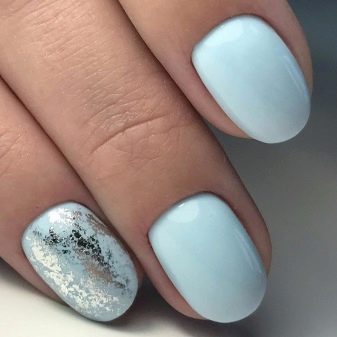 An amazing variety of options is different and blue manicure with foil. Here you can make an excellent contrast design of dark blue foil with a blue glossy or matte base. This material is replete with a variety of species. There is not only a sheet monophonic foil, but also embossed. The self-adhesive blue foil sticker is also in great demand.