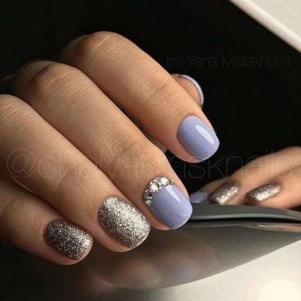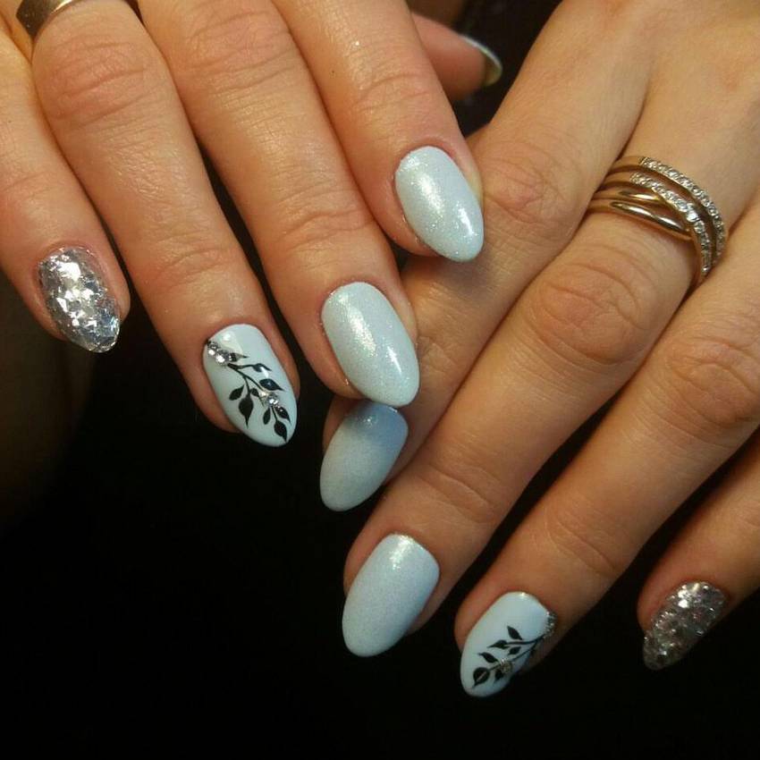 Manicure options with rhinestones do not lose their relevance. In light blue tones, small crystals on the nails look spectacular, since this tone itself is associated with water and refers to a cold range.