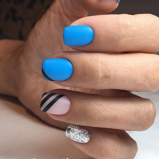 Matte manicure has recently become very popular. Modern designers come up with all the new combinations of matte and glossy coatings. In blue, such a coating looks very impressive, especially if you add not just a glossy tone, but a metallic tint to the tip of the nail. But in the use of matte varnish there is a small nuance, forgetting about which you can spoil the manicure. This is a complete drying time, which this line has slightly longer than the standard gloss.
