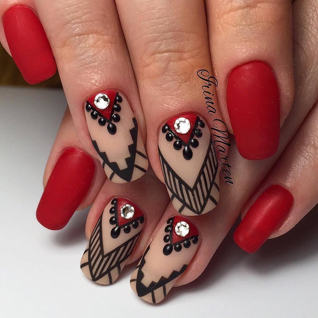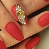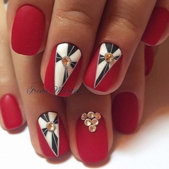 - Quite often they use the technique of geometric design. Various shapes or ornaments will look great on a background of red canvas. For example, you can decorate a few marigold diamonds. In addition, each diamond is separated by silver or gold rhinestones. On the remaining nails, you must select the transition from matte varnish to gloss. This is done with rhinestones of the same color.