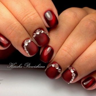 - Matte manicure with rhinestones. Especially popular technique, which uses the "cat's eye." In this case, several zones are distinguished at the same time as glossy and matte varnish. While the transition between them is marked by drawings made of rhinestones. This manicure is perfect for any holiday.