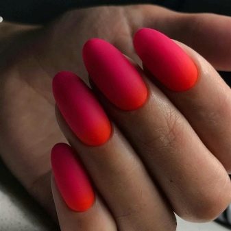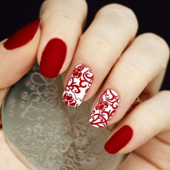 - Combinations of different matte shades will look very nice. Moreover, such a color as red allows to combine a large number of different shades. Especially if you apply the amber technique. Overflows look quite interesting on the nails.