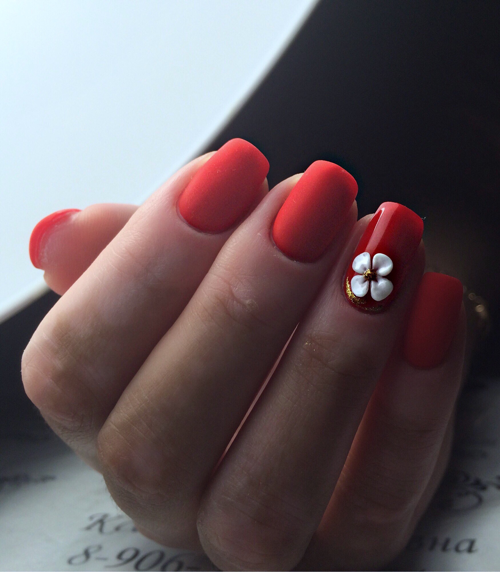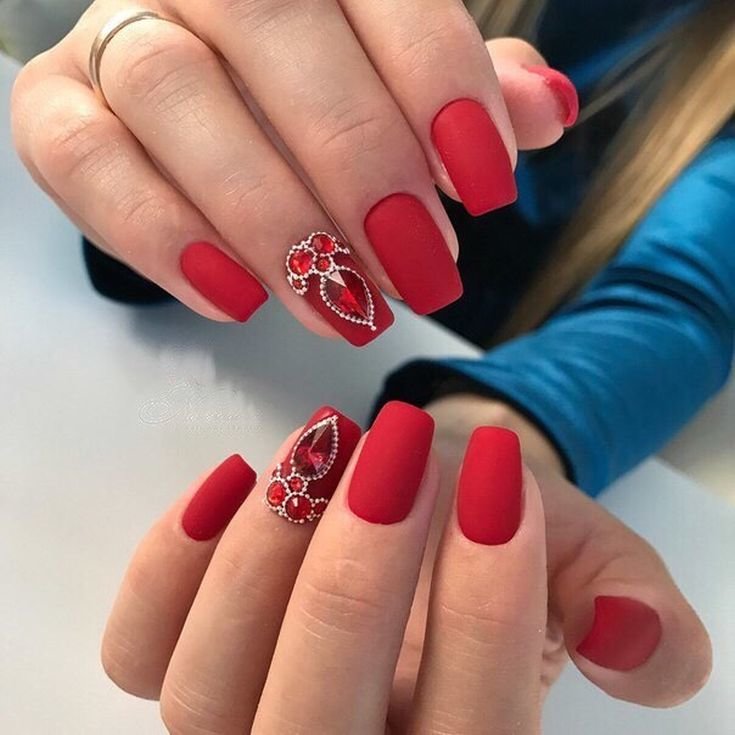 A matte manicure of a beautiful red hue is suitable for any situation, be it a trip to a restaurant or simple working days.