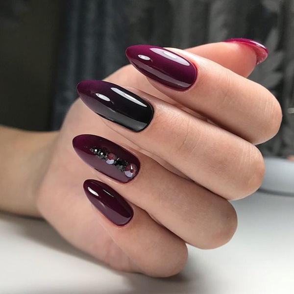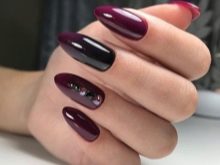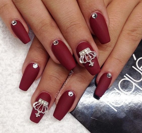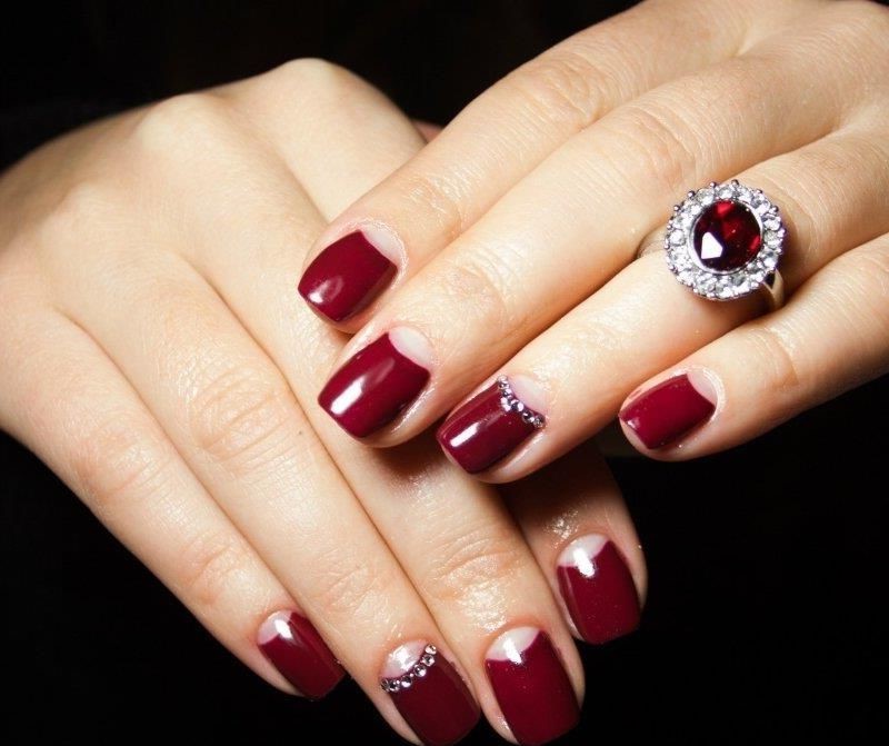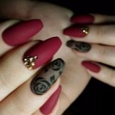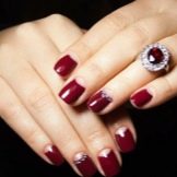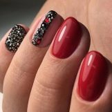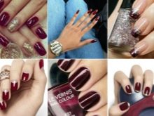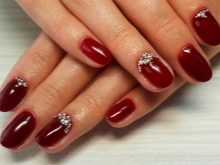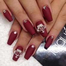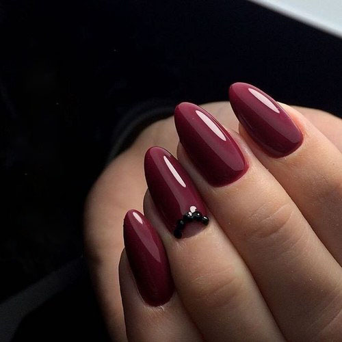 For manicure long nails should pay attention to the dark shades of red. Thus, the nails will get a majestic appearance. The peculiarity of dark tones of lacquer is in a harmonious combination with any way and style of clothing. The same goes for accessories.