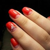 Very interesting is the combination of red glossy varnish with stickers. Glossy varnish by its nature refers to a more natural coating of nails. One application may not be enough to give brightness, so the manicure is covered with several layers of lacquer. The best decoration for a glossy finish is rhinestones in the form of stones. With them, manicure acquires a great magnificence and rich appearance.