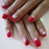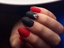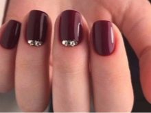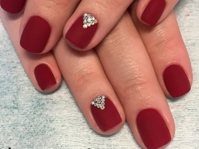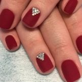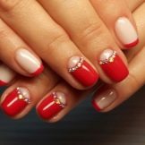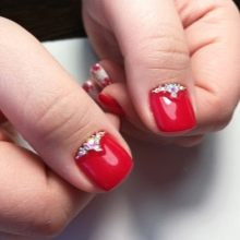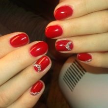 Do not worry if the nails of the fair sex are short - you will not have to deny yourself a red manicure. The design feature will emphasize the addition in the form of stones. The main thing - do not overdo it.You should not choose stones of large sizes, otherwise the manicure will turn out to be ugly and even vulgar. Small pebbles can be done moon manicure.