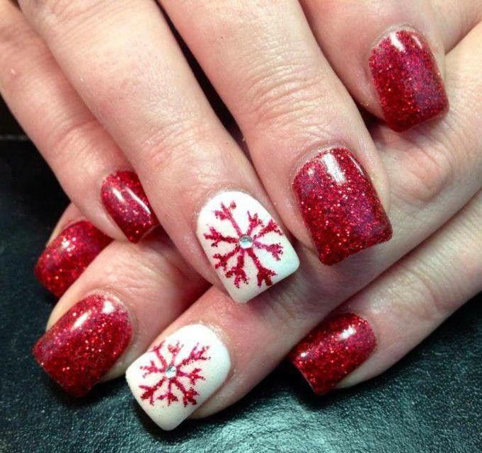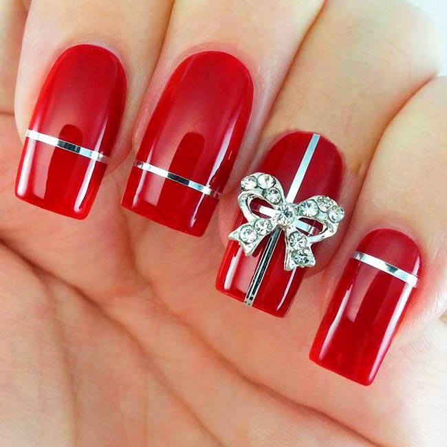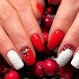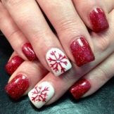 In anticipation of the holidays, many women want to thoroughly prepare for the fun. For the New Year celebration just any shades of red are characteristic. And for decoration, you can use any technology and design solutions. In this case, snowflakes are made on the nails in a contrasting white color. Ring finger has acquired a miniature festive packaging. It is important to note that each part of the New Year's manicure is decorated with stones: the center of the snowflakes, the tie of the bow and even the snowy one is more silver on the index finger. With such a manicure, you can safely wait for the arrival of Santa Claus.