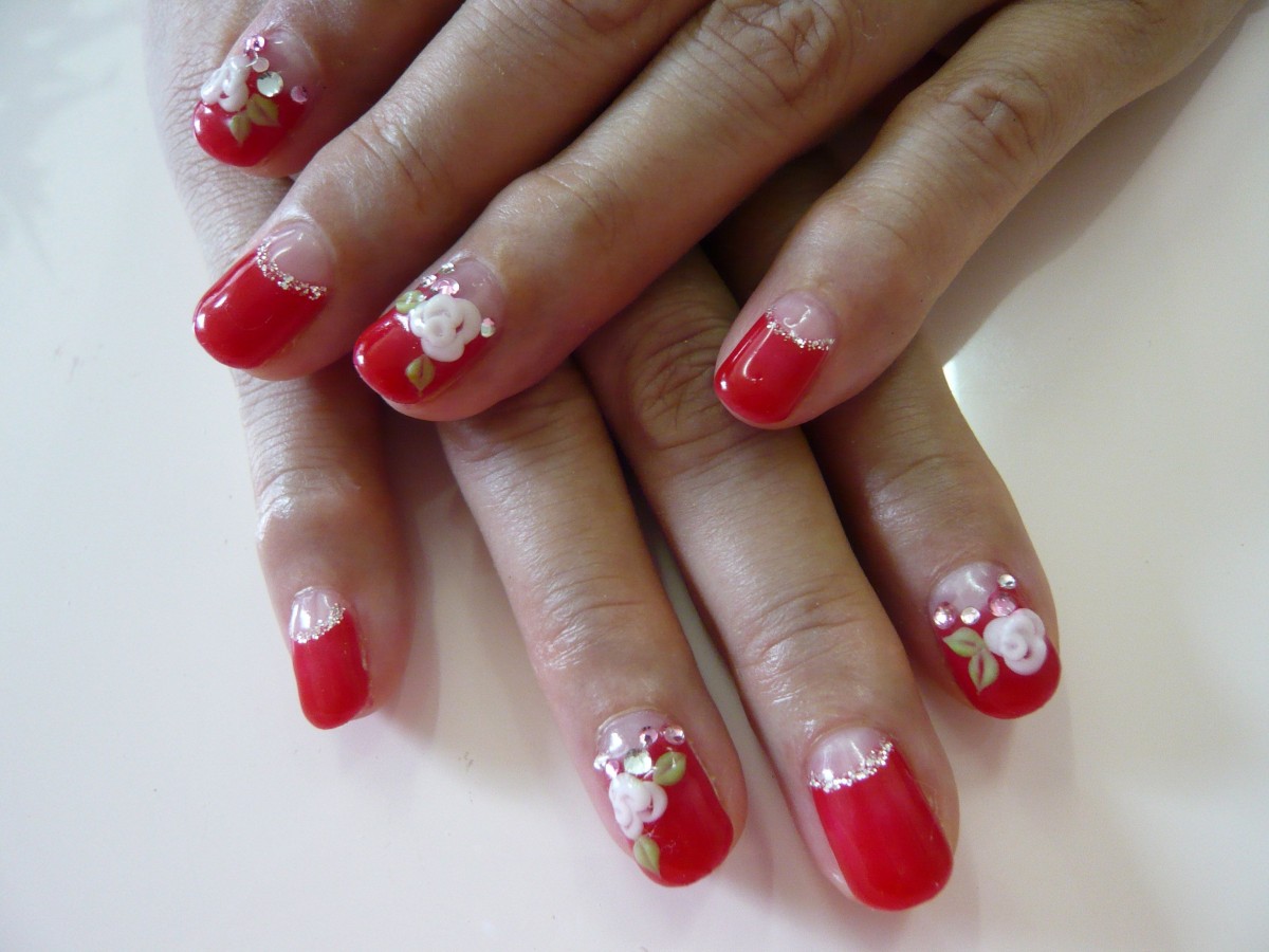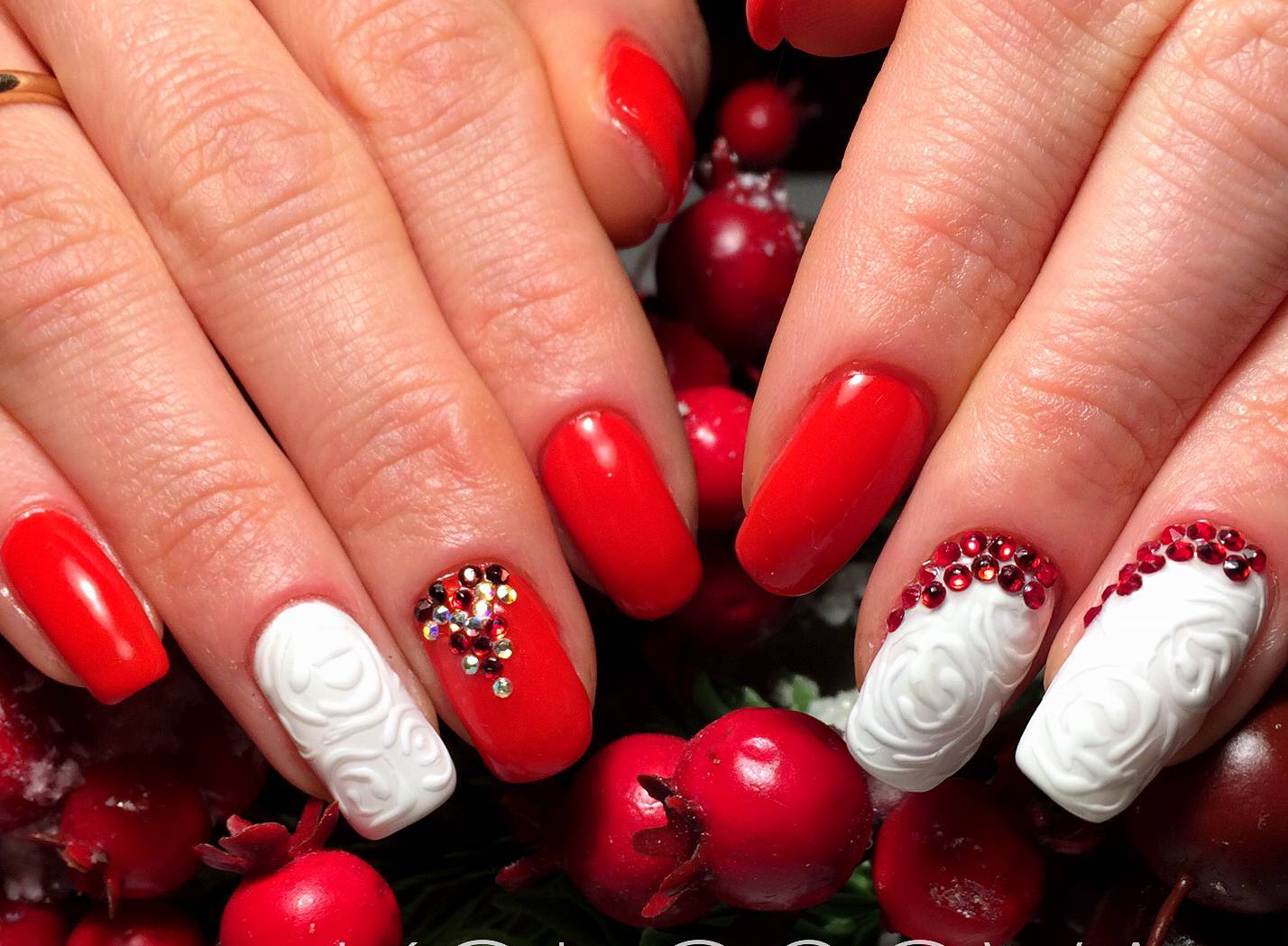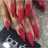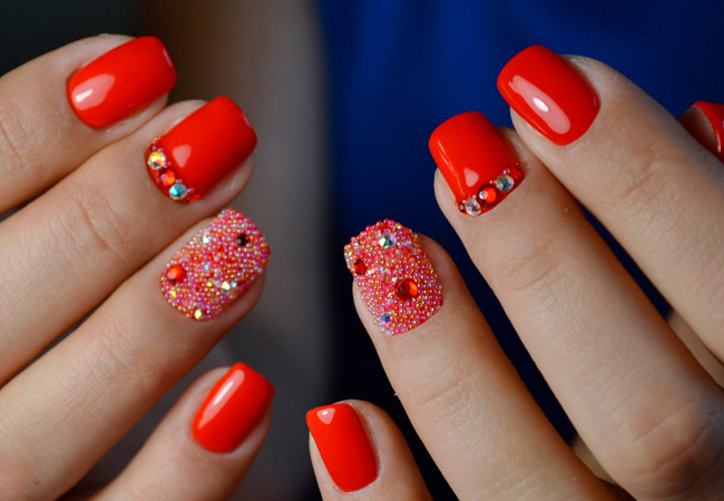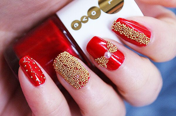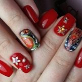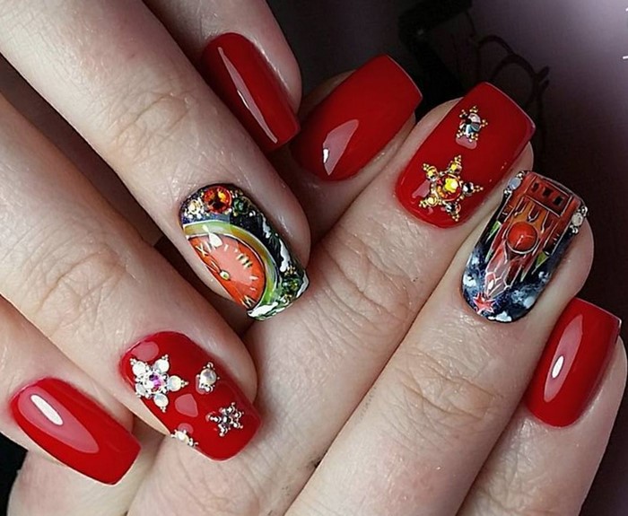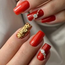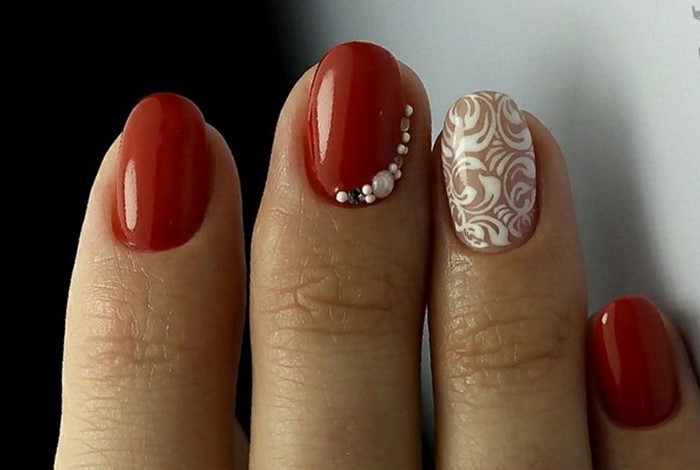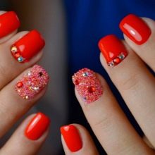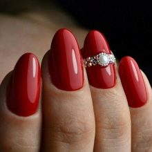Quite often, the idea of decorating the whole nail with the ring finger is practiced. And again an important detail: it is impossible that the stones were large. In addition, light nail decoration is used: on top of red, several miniature pebbles are glued in the form of a small pattern. This design will look very colorful, and its owner will feel very confident in any setting.