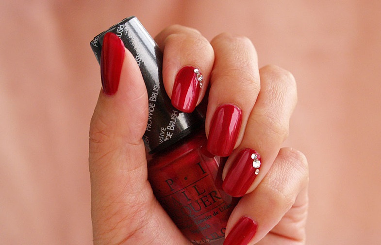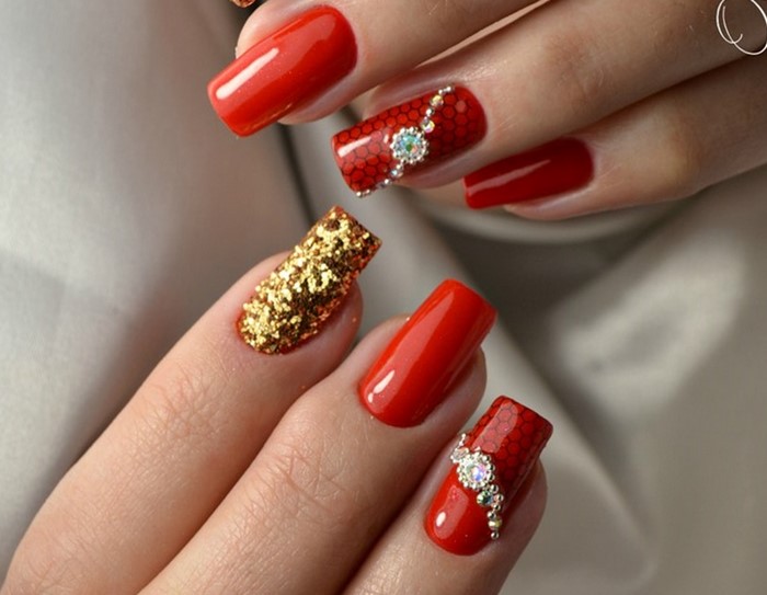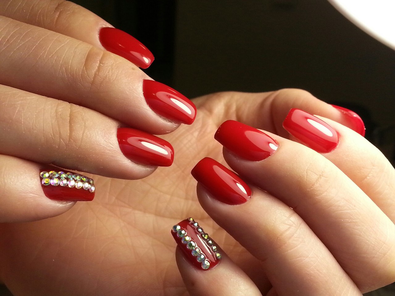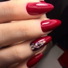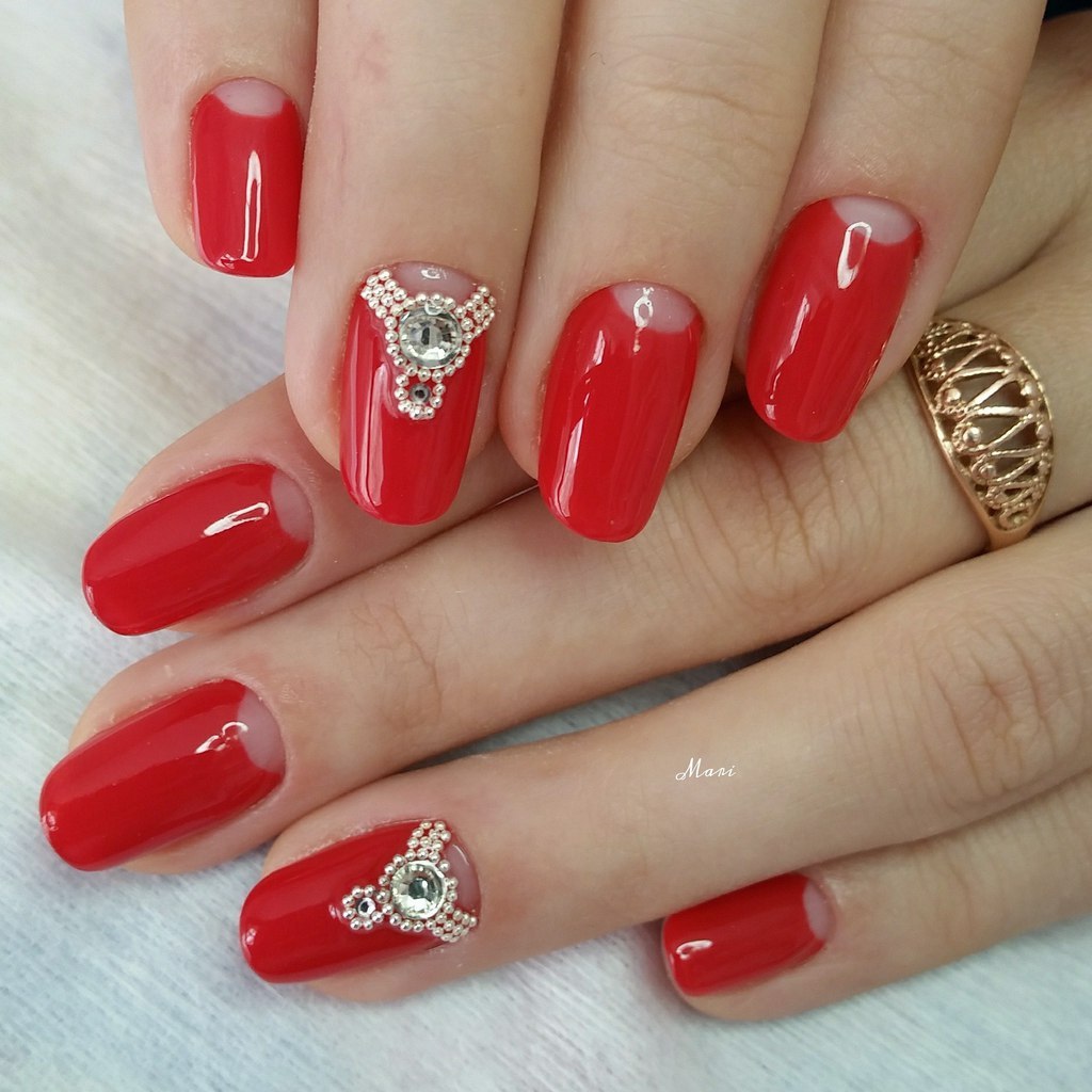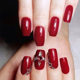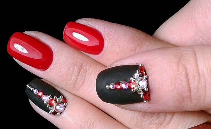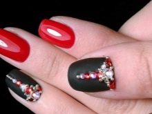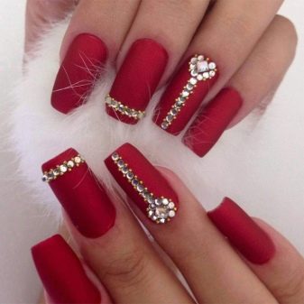 For red manicure, rhinestones sparkling and shimmering in the light are considered the most appropriate decoration. The main thing is to choose the right shade correctly so that the ready manicure looks charming.