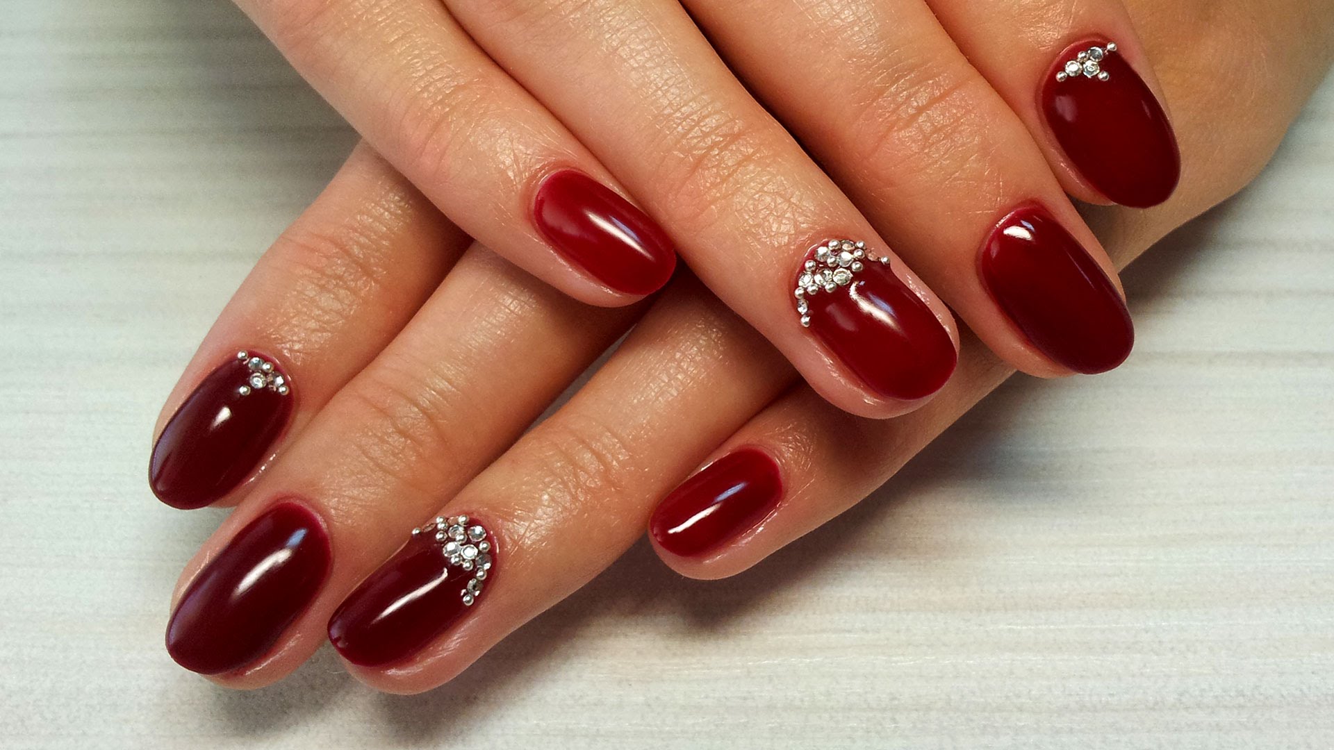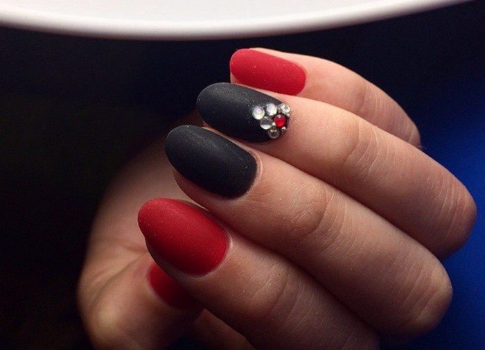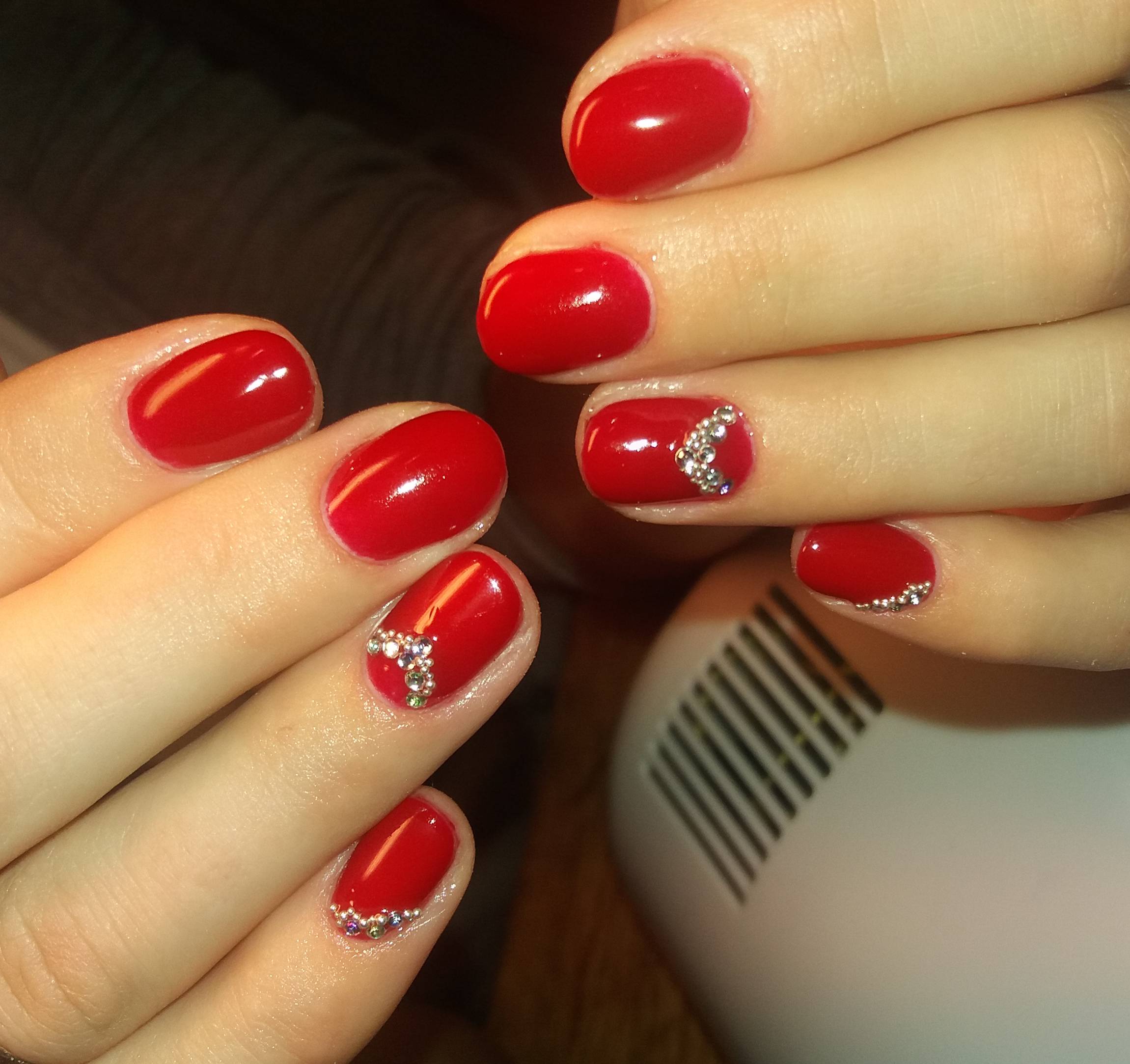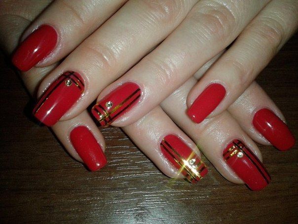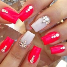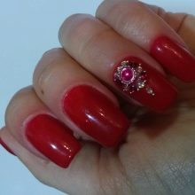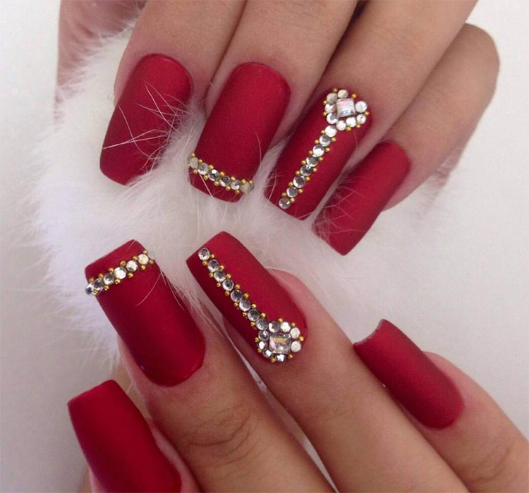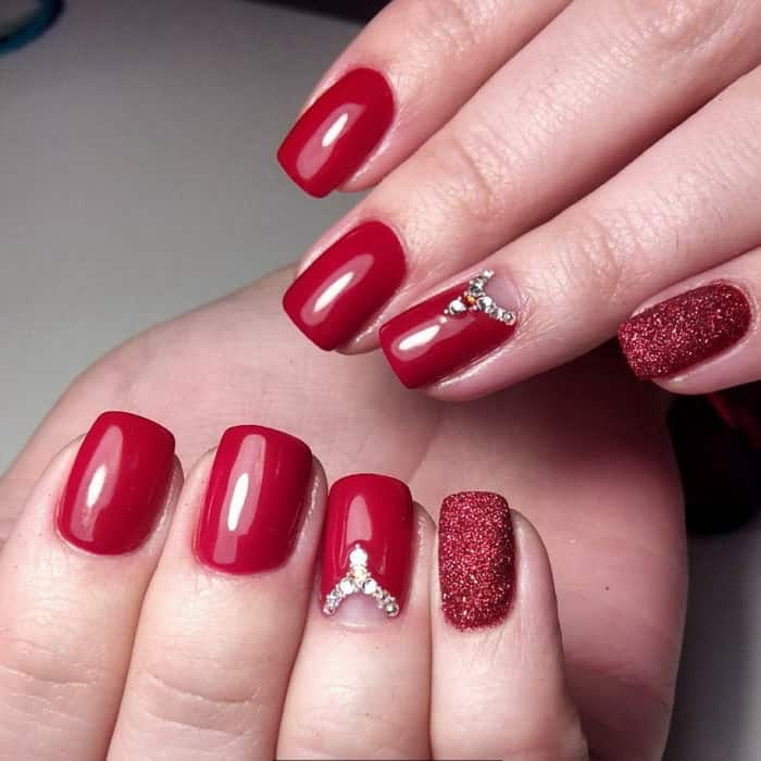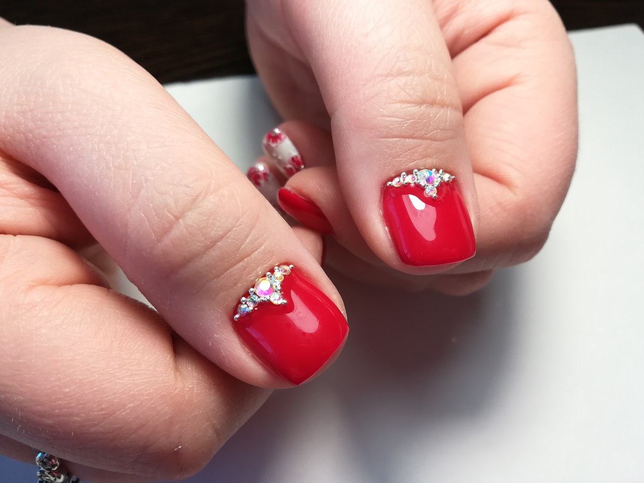 For red manicure, rhinestones sparkling and shimmering in the light are considered the most appropriate decoration. The main thing is to choose the right shade correctly so that the ready manicure looks charming.