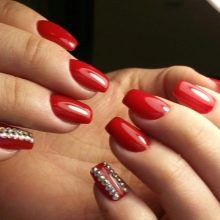 Red manicure perfectly harmonizes with different types of stones. To understand the depth of beauty and greatness of nails, you should consider several ready-made options. In this case, the basis of the manicure was a scarlet shade of red. The coating is made in several layers so that the color saturation is brighter. The surface of the painted nail plate is decorated with small stones. For decoration, only a nameless finger is selected, which is just the trend of the current season. Thanks to the pre-treatment of the nails, the finished manicure looks majestic and rich.