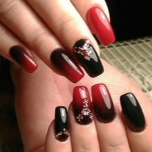 This season red color of nails has gained wide popularity. Its shades are considered universal, as they are suitable for any image and style. With a red manicure, you can go to a pleasure institution or a business meeting. In any case, the nails will not be deprived of the attention of others. The usual nail polish is a thing of the past. Today, the perfect manicure is created by the hands of real artists. Each nail is decorated with a special pattern, ribbon or rhinestones.