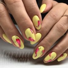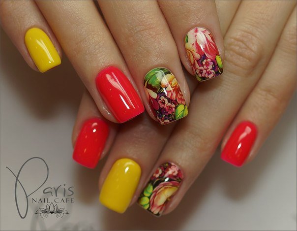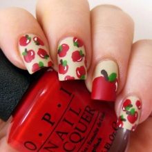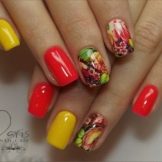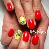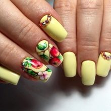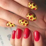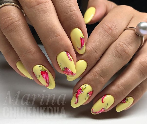Red apples, peppers, carrots on a bright yellow background will look fresh and fun. If a lady wants to see flowers on her nails, then they can be made in contrasting scarlet and yellow shades on the cover of any color.