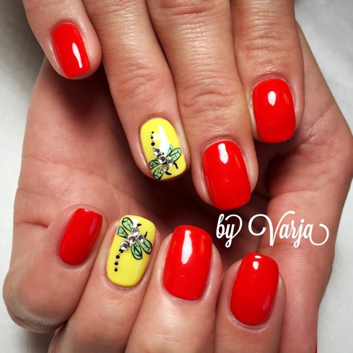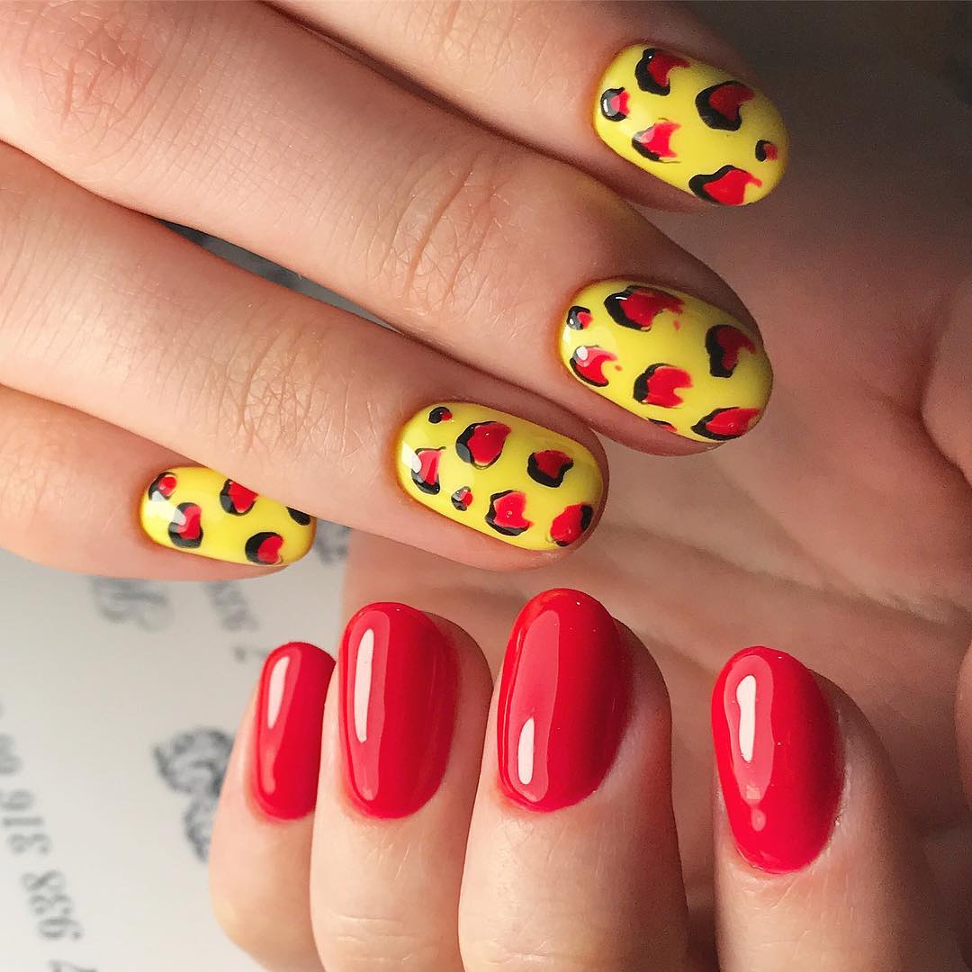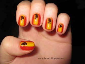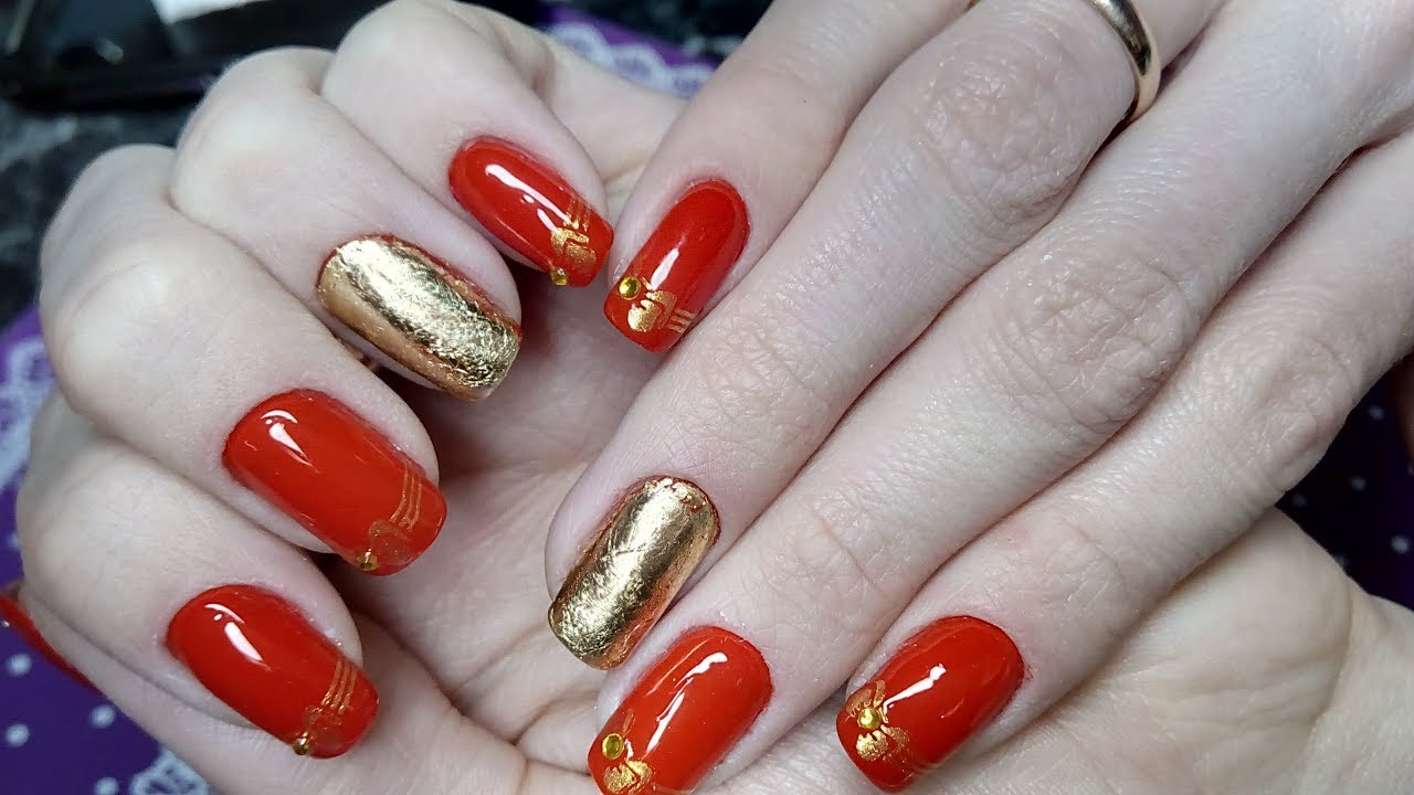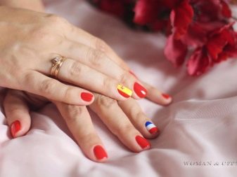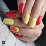 With the help of red and yellow shades it is possible to create a manicure on any subject. and using very different techniques. The design, made in this color, always attracts attention and can be used for a very different image - everyday, evening, solemn.