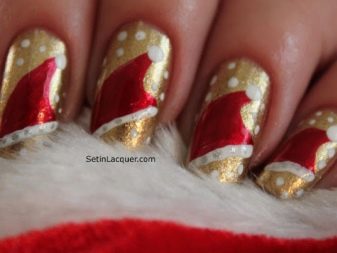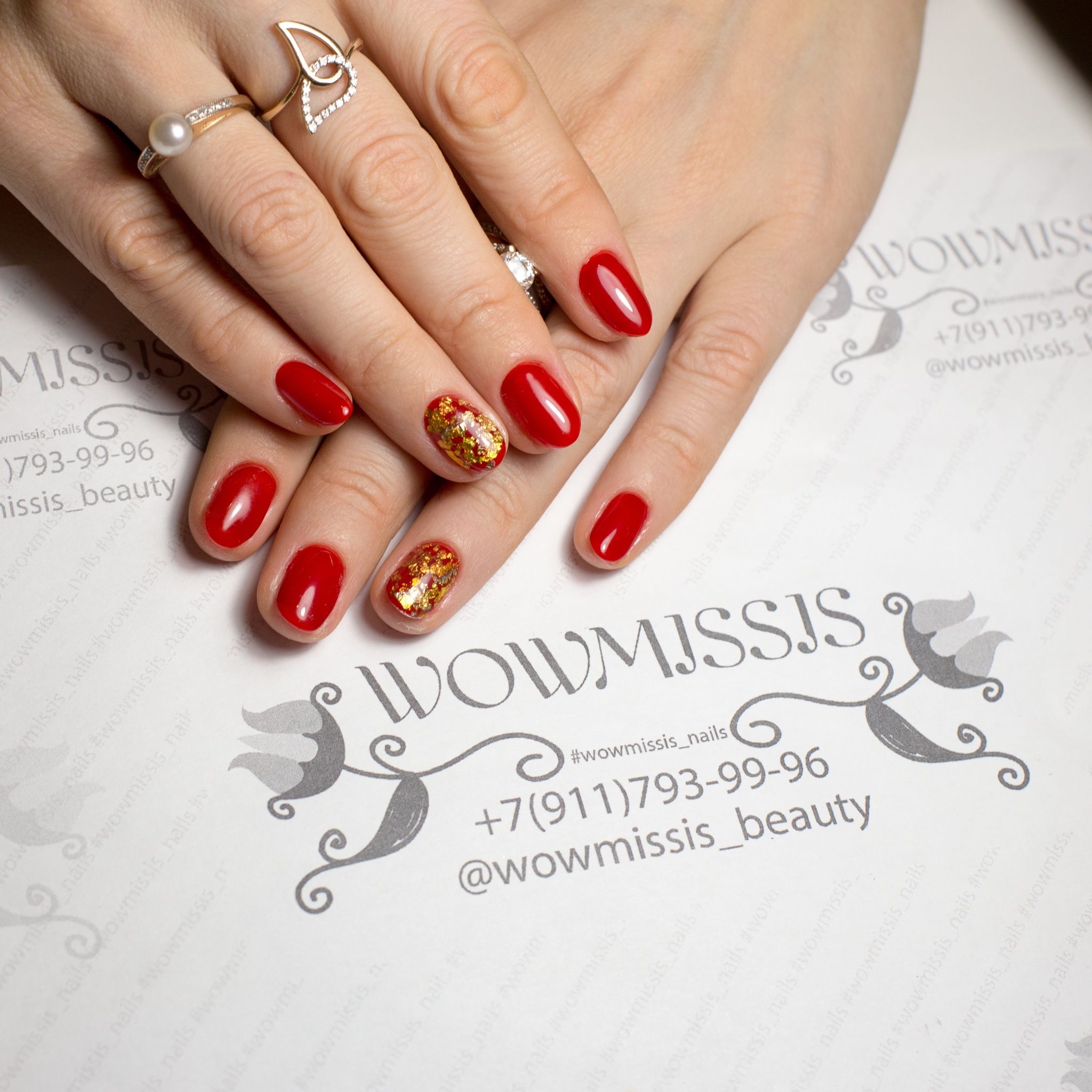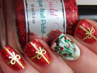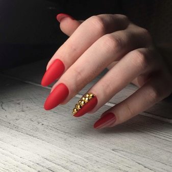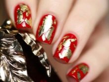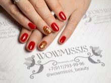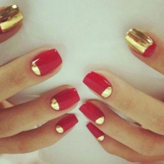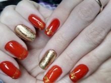 Evening version of manicure - red with golden foil. Golden mica looks beautiful on a burgundy or scarlet shade. The main thing - do not overdo it with foil. Experts recommend covering it with only two nails, leaving the other plates under the red lacquer.