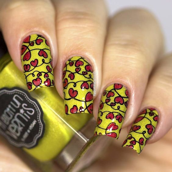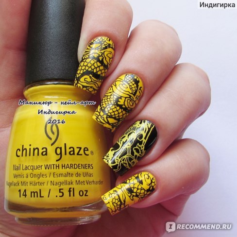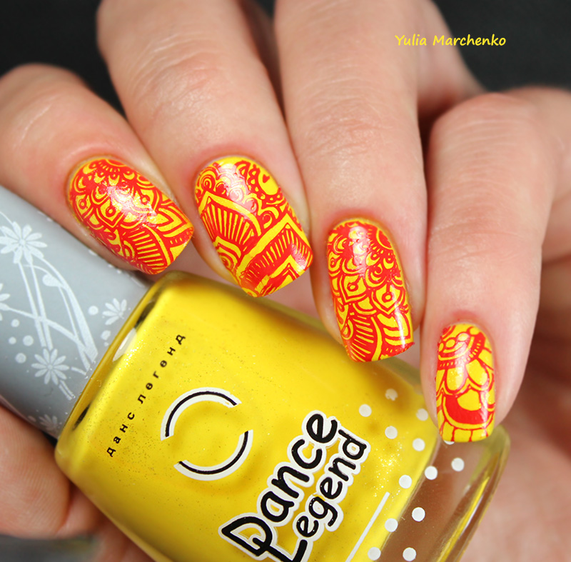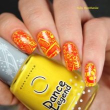 In this case, the master applies drawings and ornaments to the nail plate using special stamps. Here the imagination of the stylist and client can be limitless. Contrasting bright red and yellow patterns look great in the technique of stamping in a variety of variations.