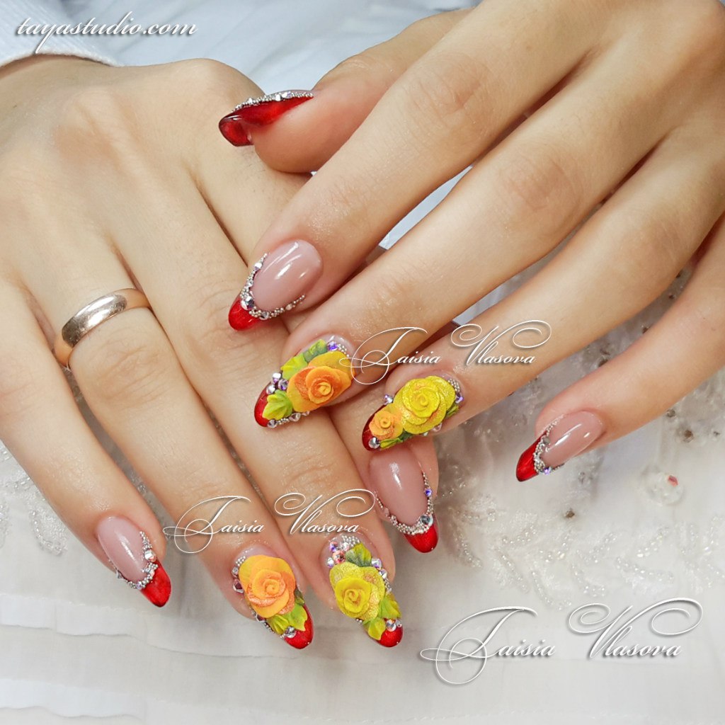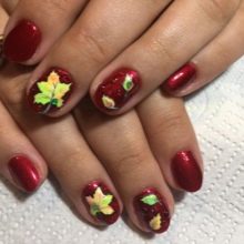 The sculpture, created using red and yellow shades, looks neatly and in an autumn-like fashion. You can sculpt autumn leaves on the cover or create a red-yellow still life. It is better to perform a manicure in the technique of modeling on the nails oval, almond-shaped and sharp. If the master uses a laconic composition in design, then generally short nails will do.