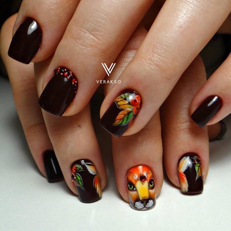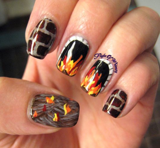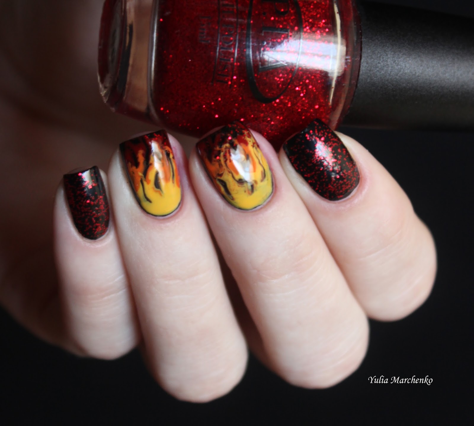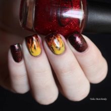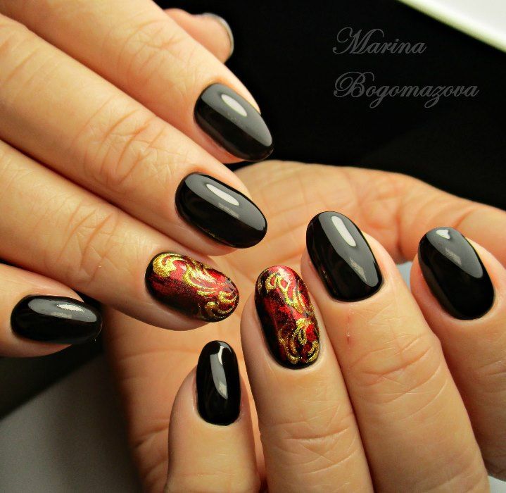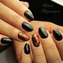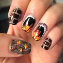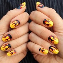 Fire manicure looks passionately and boldly. The fire can be depicted with the help of scarlet and yellow shades of abstraction, or you can draw a flame. For example, caustic flames will look very good against a black background. This is a manicure for self-confident, a little daring women. If you insert sparkles in the fire, it will give the design a bit of romance.