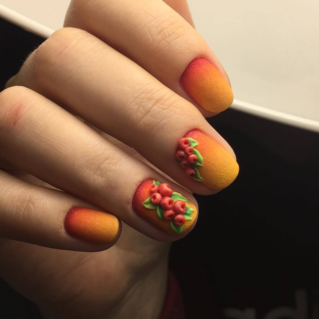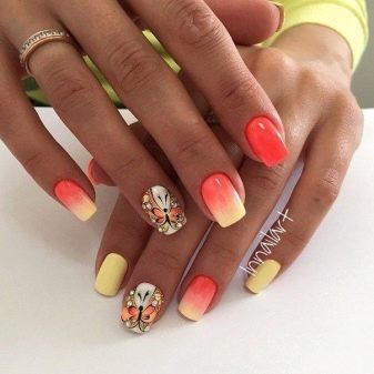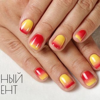 This option is a smooth transition of contrasting colors such as red and yellow. It will look beautiful if you add orange notes and other shades of red to your design. During work, the master uses a special sponge that allows you to create a harmonious transition from red to yellow. An interesting option is to perform a gradient starting from the well with a yellow color and ending with red on the free edge, and on the little finger to make the design in the opposite direction.