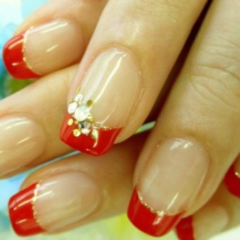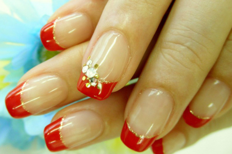 The red french dress with yellow rhinestones looks very impressive and solid. One of the design options is to perform a purple French manicure on three nails, completely cover two nails with the same varnish and glue yellow and orange rhinestones on top. From the rhinestones, you can create a bow shape, necklace, star or any other image.