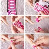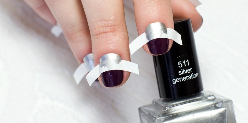 - First of all - it's scotch. If you want to create patterns with it, prepare templates in advance; if the target is a neat coating, three strips for each nail are enough. For these purposes, you need a narrow type of tape: stationery, painting, electrical tape. Glue the stripes on the sides and at the end, press it properly, as if framing the nail. After you can begin to apply varnish.