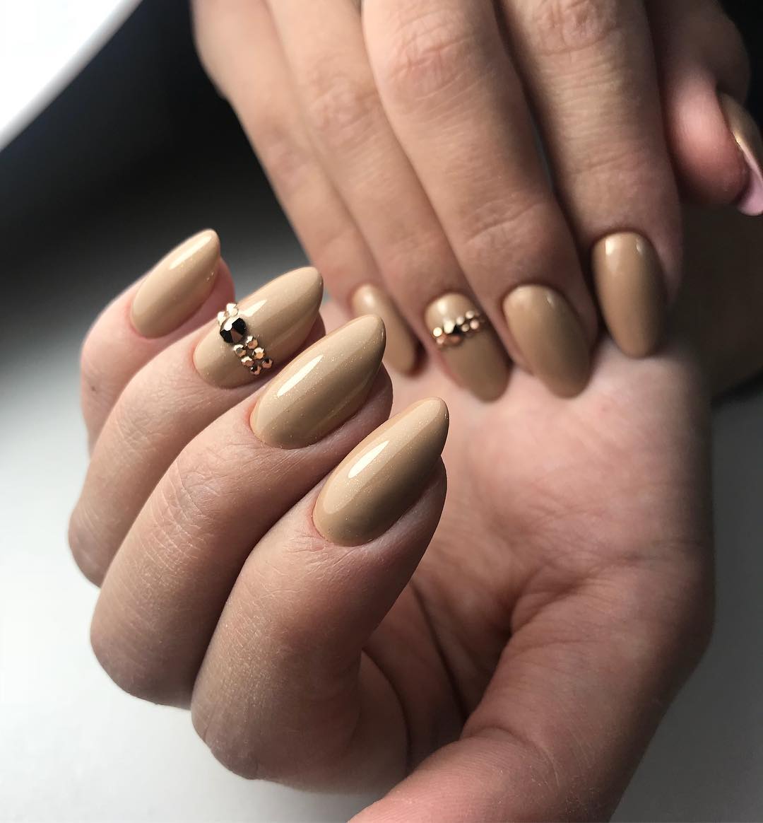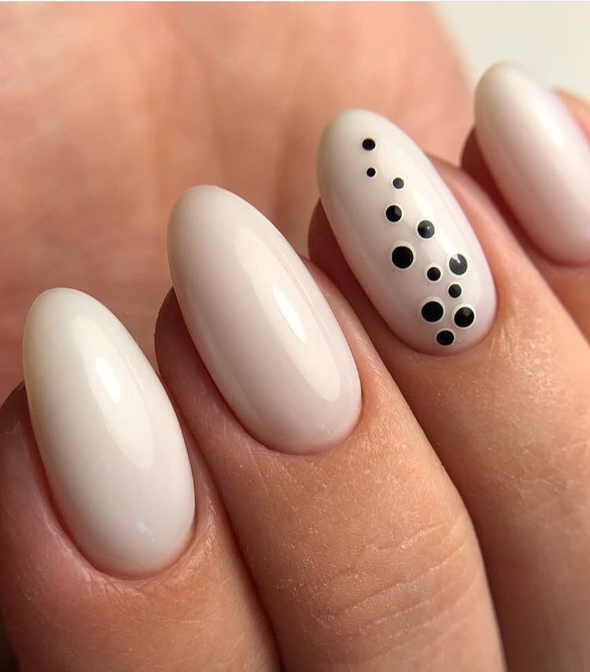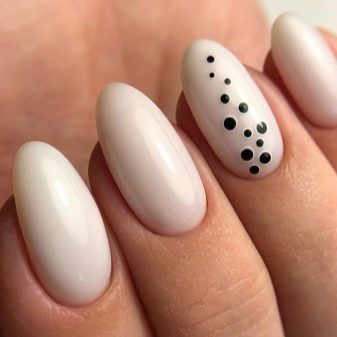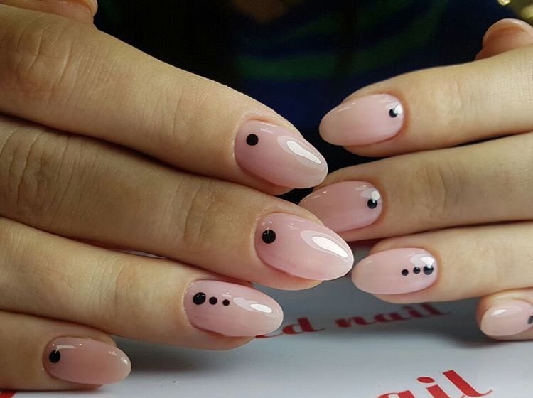 - Dot minimalism. Another hit of the season is minimalism, points in it play practically the main role. Here the same principle works as with geometry - randomness, the absence of rules for the location of points allows experimenting. Nude coating and a few points in the middle of the nail, even after a month can look very neat.