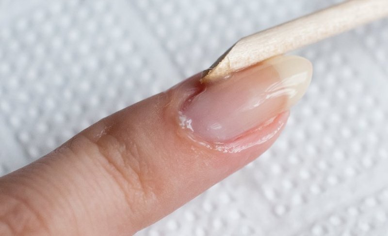 - the nail must be dry, the wet plate may peel off, in addition, it is difficult to notice the pterygium, which must be removed completely;