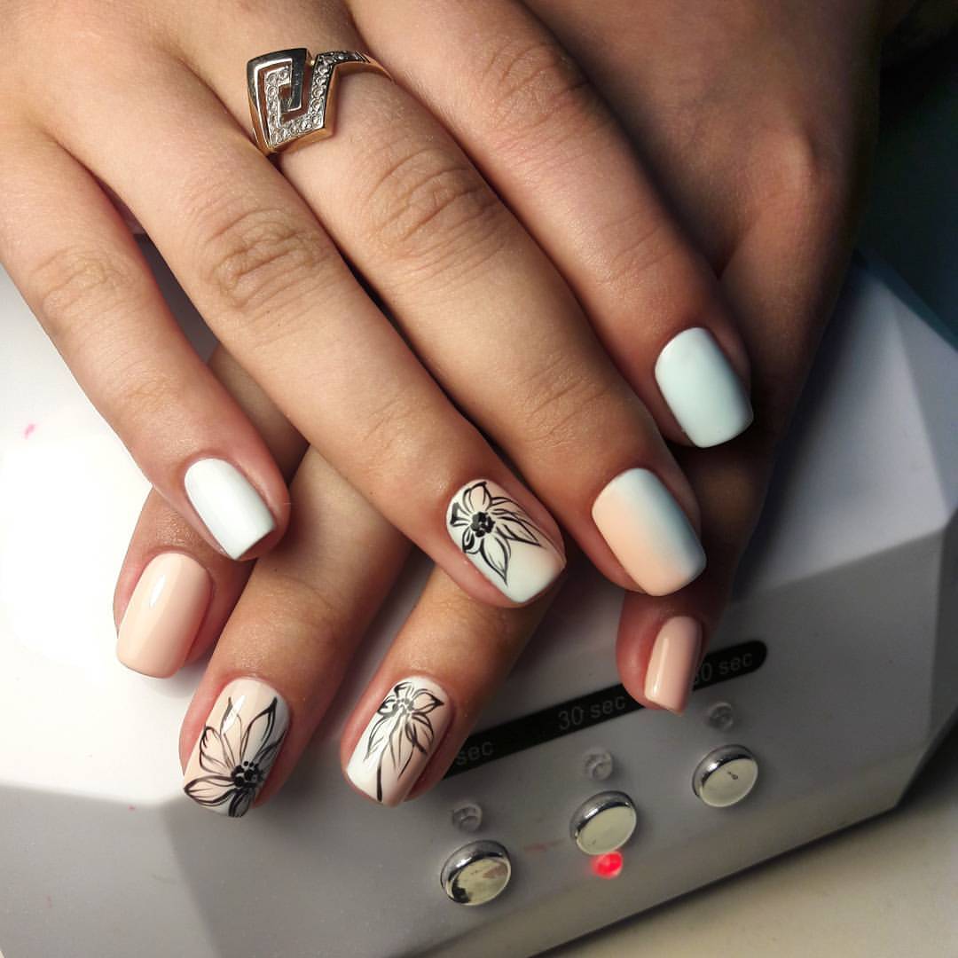 The theme of using white and black will never run out. Some designers still like the chessboard very much. It is easy to make it, it is enough to apply a white or black tone as the base layer, then paint the nail with an acrylic paint and a thin brush, and you can not paint the surface completely, but use the element only from the side in combination with other drawings.
