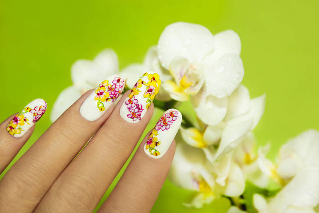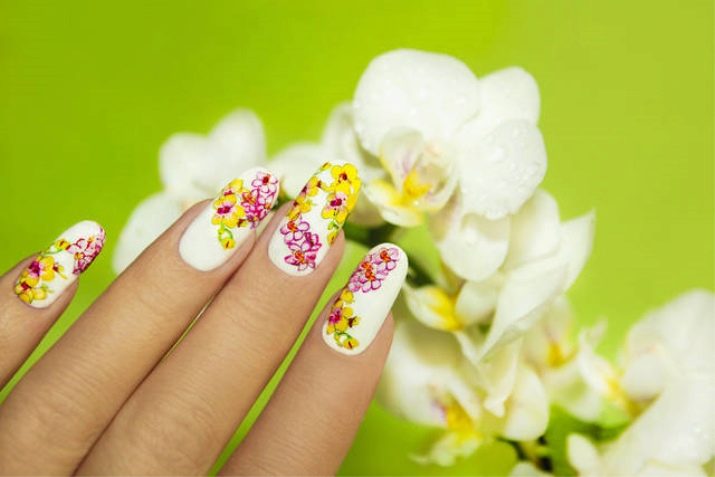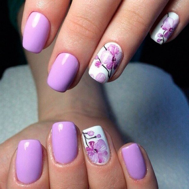 If the length of the nails allows, you can draw flowers on all the nails, with 2-3 orchids on the nail, but if the nails are small, then preference should be given to the design, when the design is created only on medium or ring fingers.