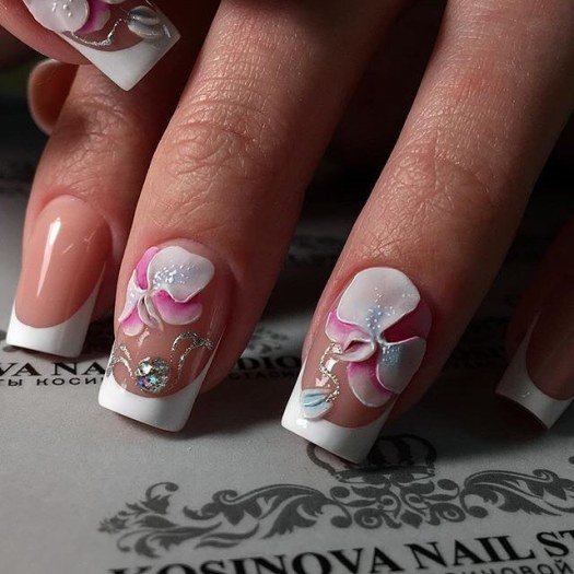 White orchids on the nails are often depicted in honor of the wedding ceremony, but the small pink options are suitable for every day, and for any event.