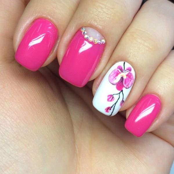 - Manicure can look very advantageous when the nails on the middle fingers are covered with light varnish and orchids are painted on them, the nameless ones are completely covered with stones and rhinestones to match the main color, and all other nails are covered with a pink shade.Such a manicure will be a great solution for creative women, as well as for women who want to get a good mood for every day.