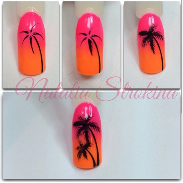 It is not necessary to draw a palm on each finger - for example, for greater originality you can draw them only on one finger or on two nails of each hand. Here you need to build on whether the hostess is going to fly on vacation, and maybe you just need to add brightness to your hands and at the same time continue to sit in the office and work.