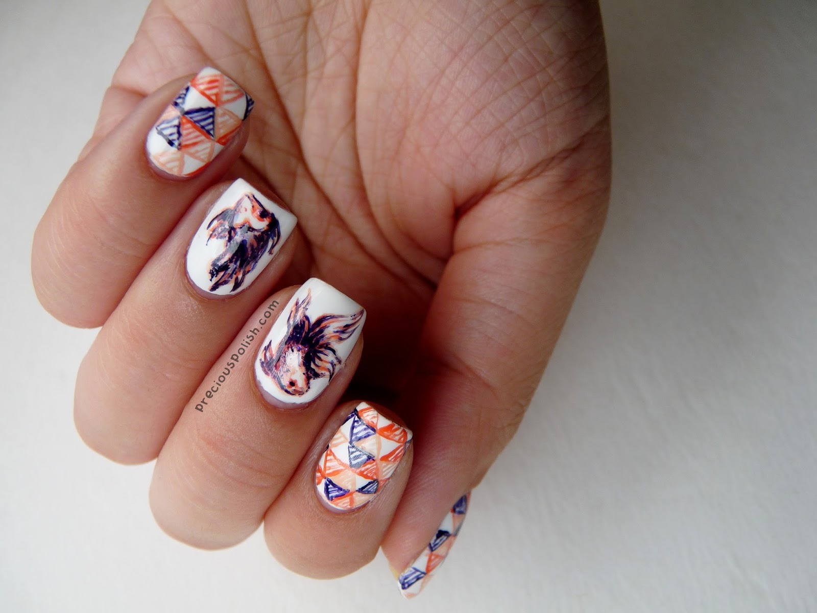 Fairy-tale fish on a white background. To create such a design, you will need watercolors for the nails in the following colors: