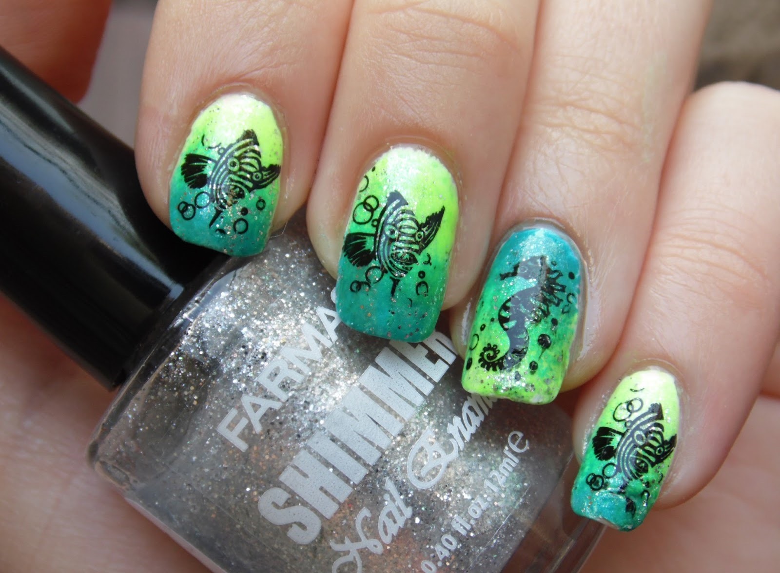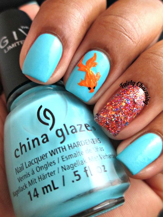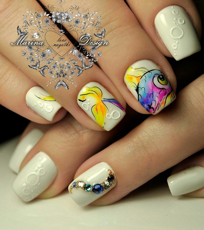 Gold, however, like any other fish, it is difficult to imagine without the sea, so the manicure contains various sea shades: from turquoise to dark blue and even black. Also relevant are all manifestations of yellow, green, white, blue. Among the primary colors must necessarily be gold. However, the glitter of gold on fish scales can be replaced with rhinestones, sequins and other additional components.