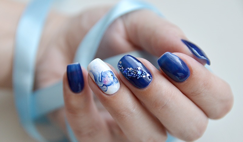 First of all, the nail plate is covered with a thin layer of white gel polish and dried in the lamp. After that, a blue paint is applied to the nail in a chaotic manner. Then, without brushing the brush, add green (you can also use a bright blue color) strokes and again dry the nail.