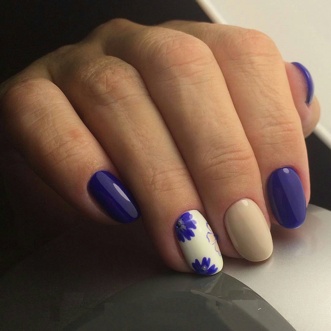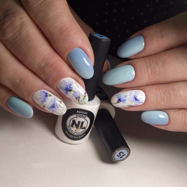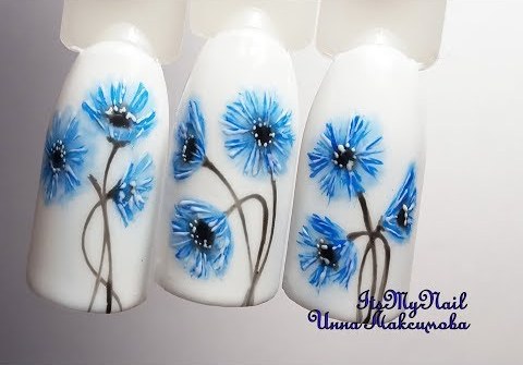 - Preparing the base of the nail: in one of the cases - light pearly varnish. Smears of blue, white and black lacquer are applied over the layer. Fantasy will aesthetically combine the means of various shades.A large cornflower is carefully formed, or several small flowers, as well as buds. How to draw cornflowers, you can peep from the monitor or remember what they are, from school lessons. Acryl is very plastic, it will allow you to create your floral masterpiece.