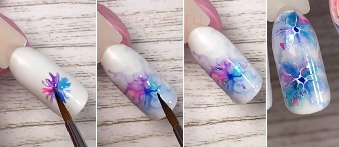 - Watercolor technique always relevant. Acrylic paints diluted with water are used. The advantage is that the acrylic does not dry while in contact with water, which makes it possible to modify the pattern already on the nail plate. This method is considered classic for many masters and the most popular among clients. Such a manicure is relevant in the spring and summer.