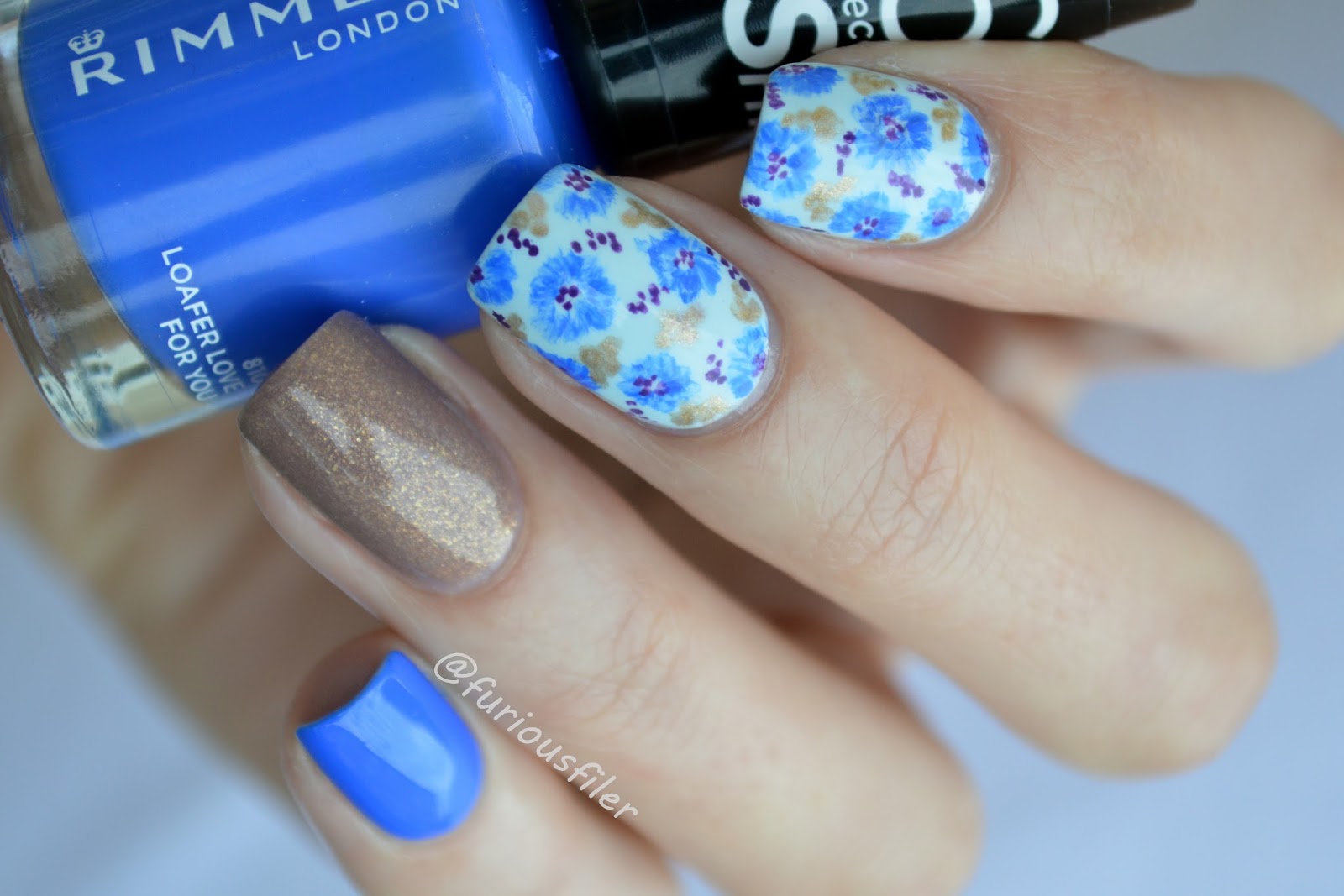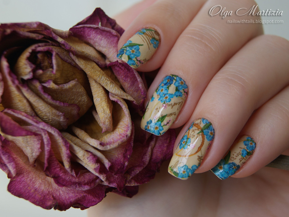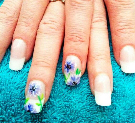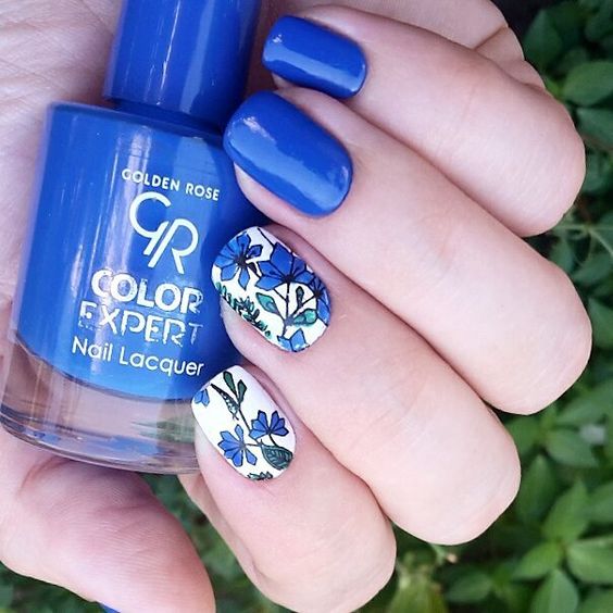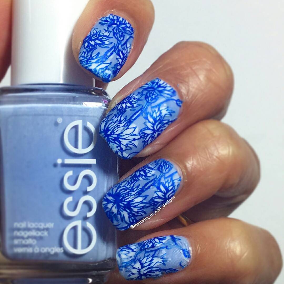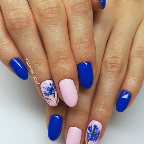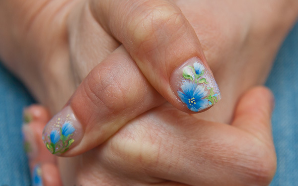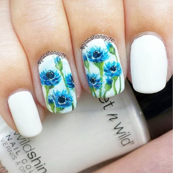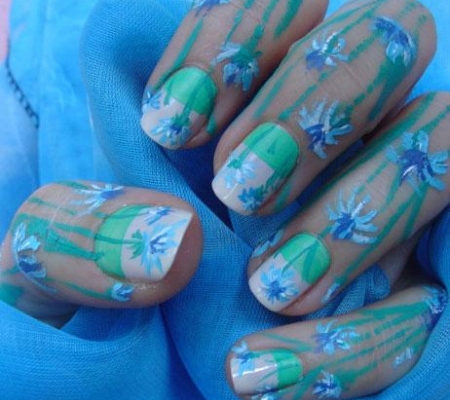 Cornflowers on the nails are depicted using various techniques.