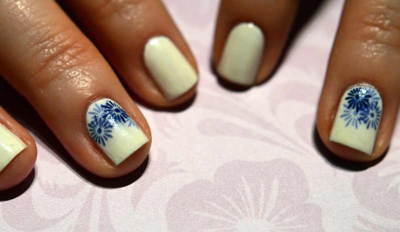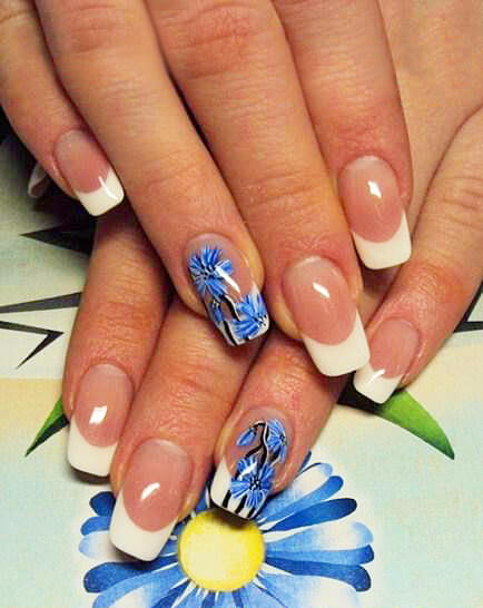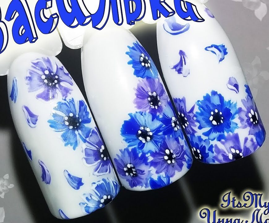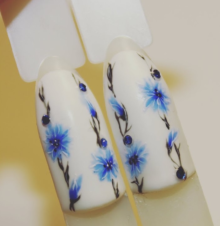 It is on a white basis that the cornflowers emphasize the graceful fingers of the owners of a popular manicure.