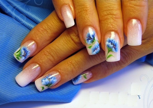 Floral motifs for aesthetic and beautiful manicure are always relevant. Delicate roses on the fingers of the bride, daisies on a white background for a summer holiday, orchids for a real lady - each has its own taste, its own choice. What is interesting in such equally popular colors for nails, like cornflowers? They are attracted by the bright colors, the association with unlimited freedom and innocent simplicity.