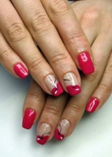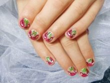 Cherry manicure gel varnish is also performed using brushes to paint the pattern, but it is fixed not by simple drying, but by an ultraviolet lamp, due to which it becomes durable and lasts a long time. And you can also perform a volumetric manicure with a thick drop of gel. Of the minuses of such a manicure, you can note a decent cost and the fact that nails must be sanded before applying gel polish, removing the top layer, which does not have a good effect on the health of the nail plate.