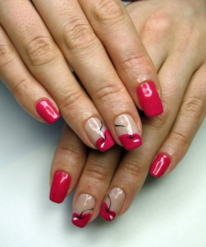 Looks luxurious imitation of French manicure with cherries. This design can be done on all nails, and only on the middle and ring fingers. To create it, follow these steps: