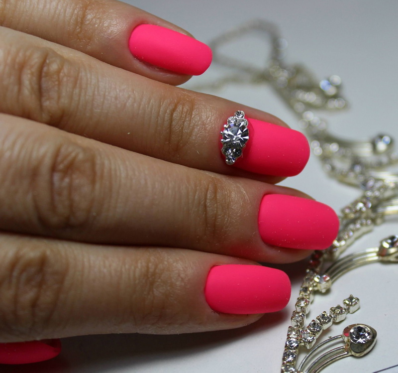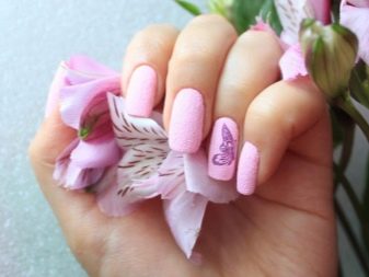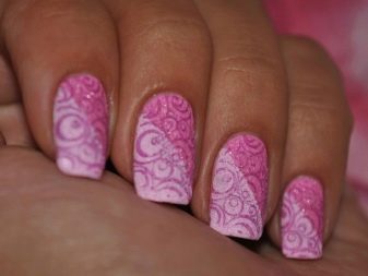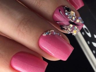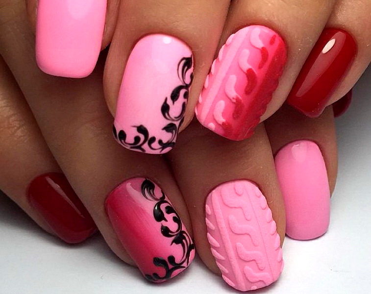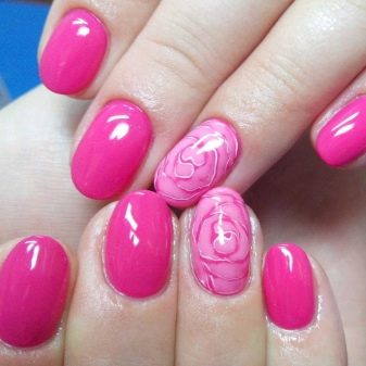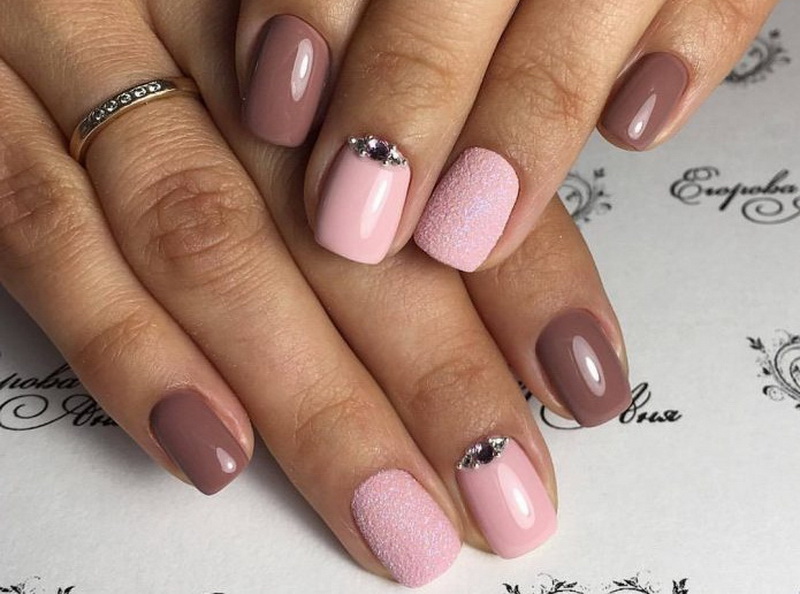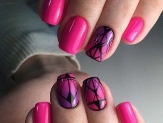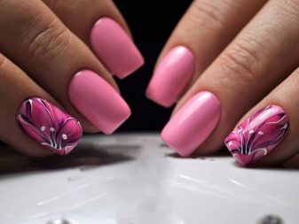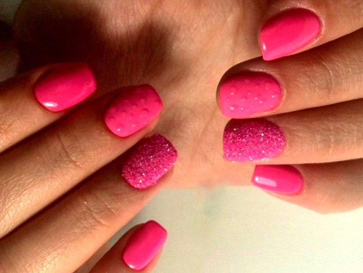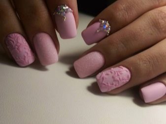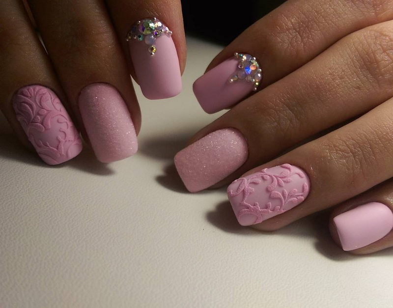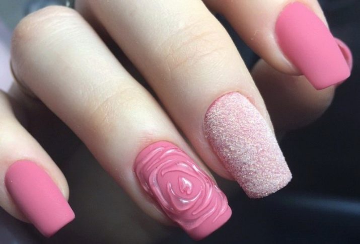 You can combine different types of textures. For example, one of these solutions is a combination of matte and glossy coatings. Beautifully look glossy pattern with curls or geometry on a matte basis of the nail. Those who prefer the volumetric type of texture will like such decoration techniques as acrylic powder and bouillons. Today you can choose this decor in a wide range. As for the pink tones, it is possible to choose options not only in a relative, but also in an identical tone.