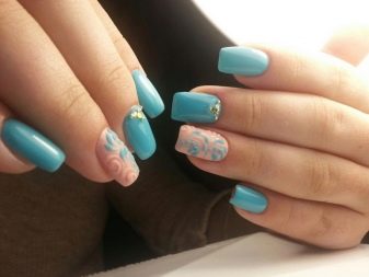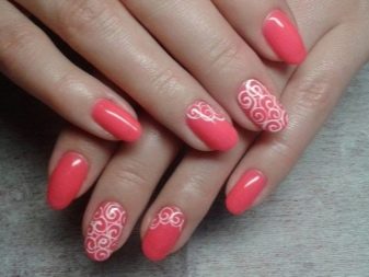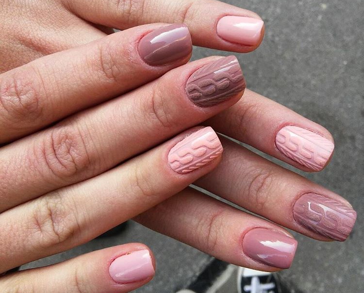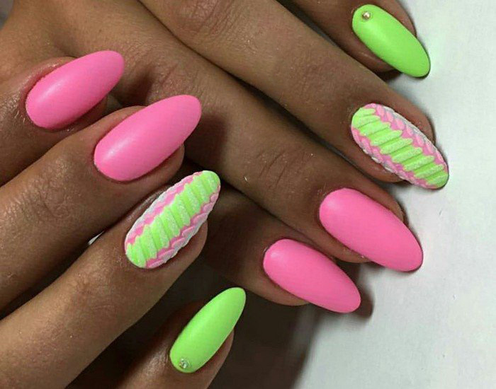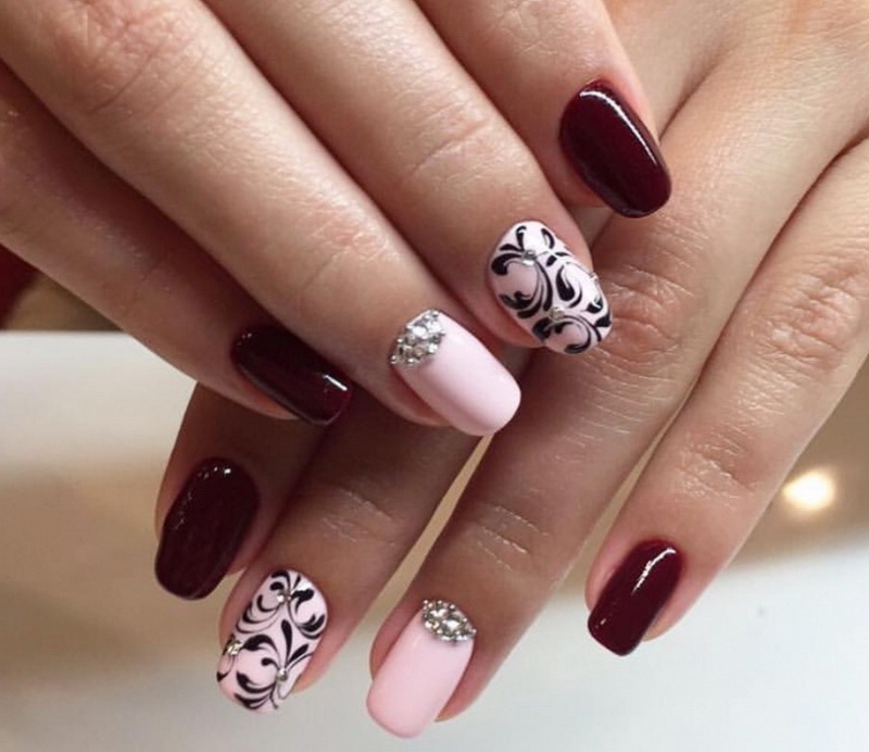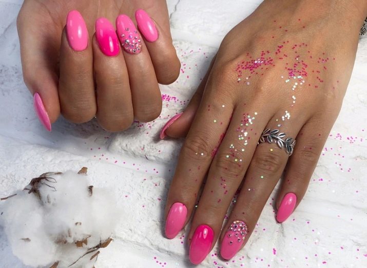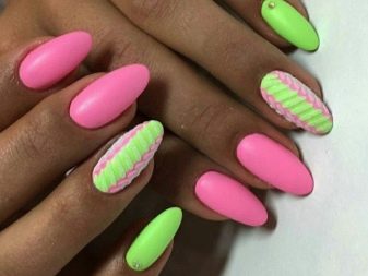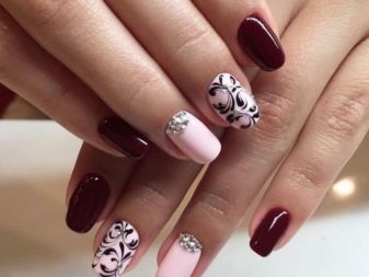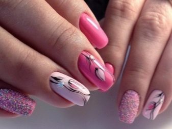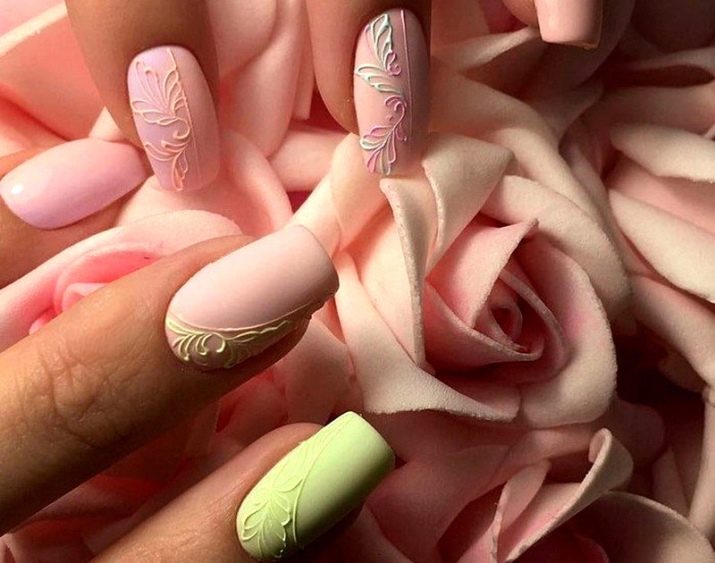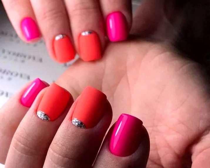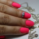 You can combine different types of textures. For example, one of these solutions is a combination of matte and glossy coatings. Beautifully look glossy pattern with curls or geometry on a matte basis of the nail. Those who prefer the volumetric type of texture will like such decoration techniques as acrylic powder and bouillons. Today you can choose this decor in a wide range. As for the pink tones, it is possible to choose options not only in a relative, but also in an identical tone.