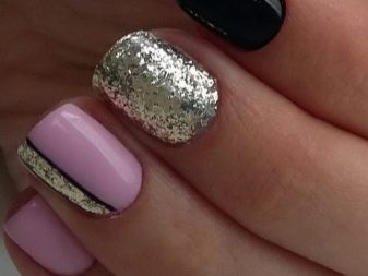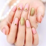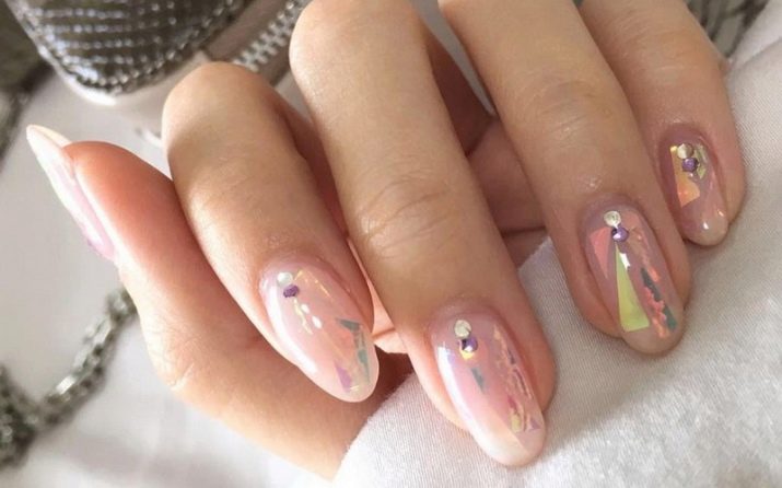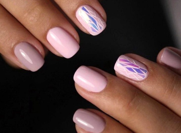 A stylish and trendy solution will be coating in the technique of "broken glass". For such designs use a special film, which is cut into small pieces, and then spread on the nails, simulating various forms of geometric shapes or completely covering the surface of the nail plate. On a light pink background, they will seem like broken glass, while on a dark pink they will play with all the colors of the rainbow. This is a great solution to emphasize manicure.