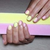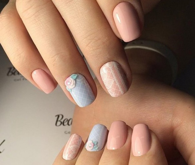 - Creamy pink manicure with painted lace in pastel colors and lemon contrast will not leave indifferent any woman of fashion.