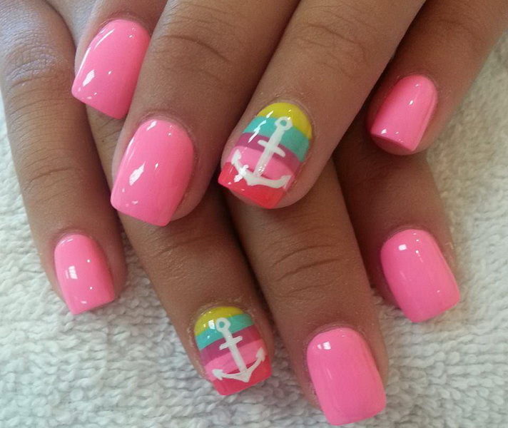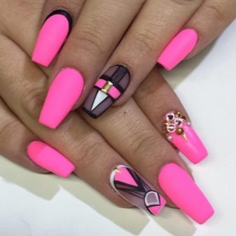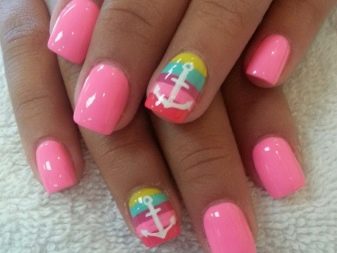 The design, accentuated by seasonality, perfectly convey thematic images. For example, pink manicure for summer can be decorated with various bright prints with images of insects (May beetles and ladybugs will be especially popular), ripe and juicy fruits, beach and sea landscapes. At the same time shades of pink for summer designs should be bright and rich.