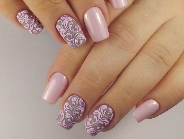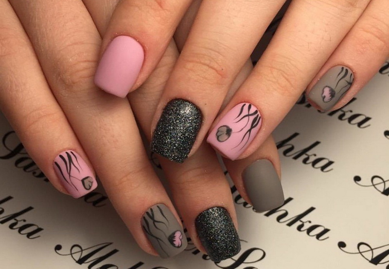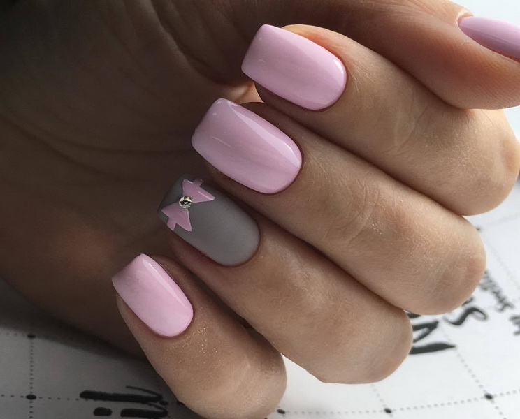 - Delicate pink and gray design with a matte texture, pattern and acrylic powder will help to diversify the female image.