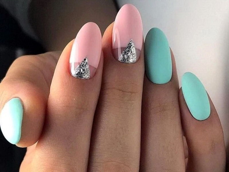 - Harmonious pink-turquoise design in the technique of negative space is supplemented with silver in the form of a geometric figure.