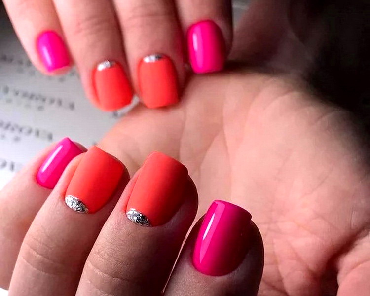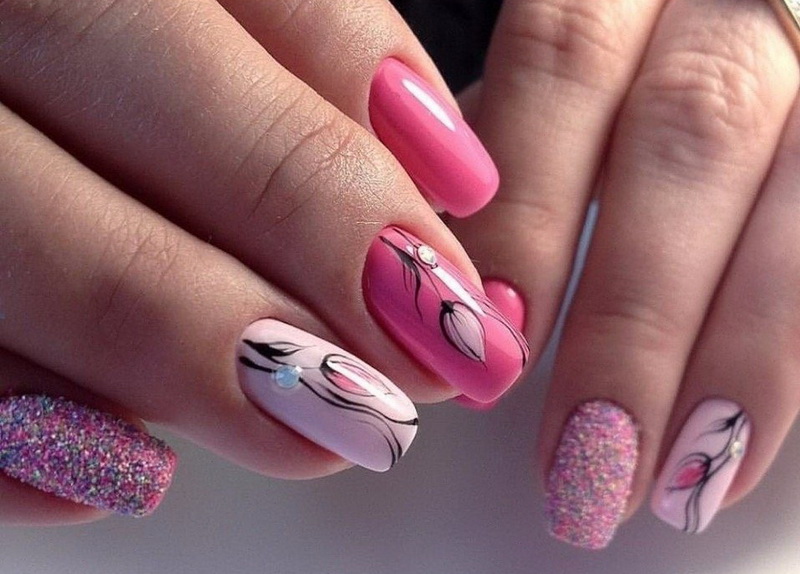 In fact, the pink color is harmoniously combined with many shades of pastel and nude scales, including delicate light green and tan.As for the dark tones, you need to take into account their number: when there is a lot of dark in the manicure, the pink color is lost as the background of the manicure.